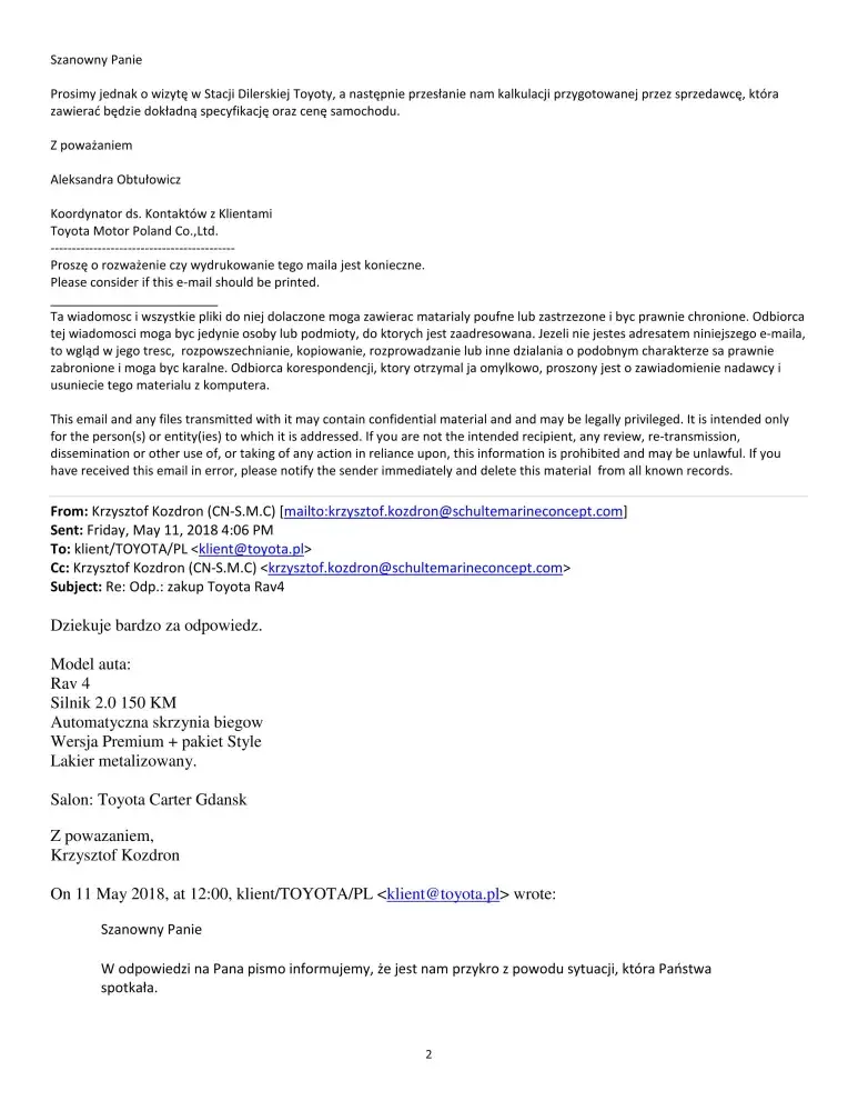 On 25th April 2018 have sent humble e-mail to Toyota Motor Poland asking politely for help with the purchase of the same model, same price, thought with deferred payment (due to a/m min.90 days insurance/Police processing period). Have politely asked for 90 days deferred payment, and declared initial payment of 30, 000 PLN from rest of the family savings (total cost of the car was about 130, 000 PLN).