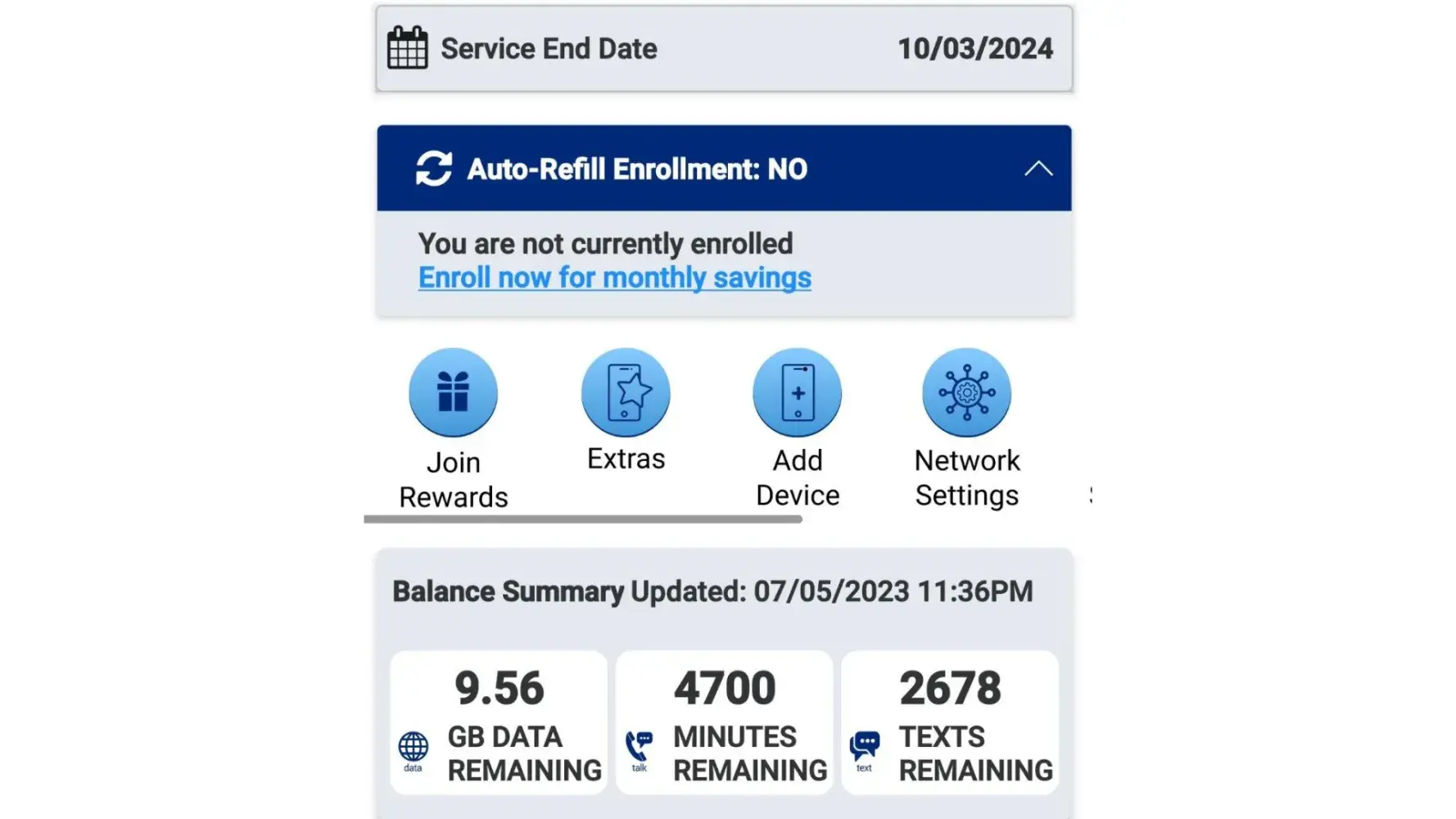 In July 2023, I added a one-year card to my Tracfone, giving me 9.56GB of Data, 4700 Minutes for Phone, and 2678 Texts.