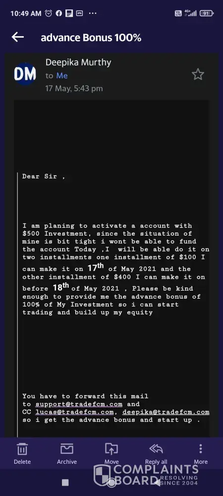 But I said I need to watch your trading after that I will decide. But Mr. Abhishek said it's just a formality please email support team for your bonus. Then only he started the trading.