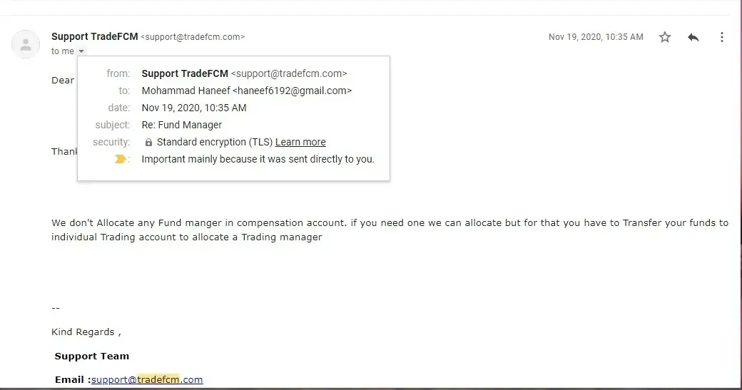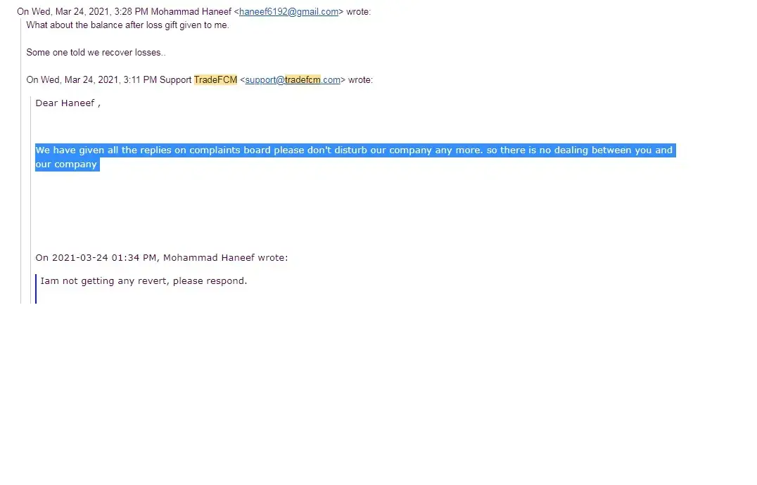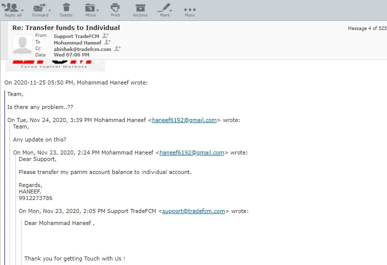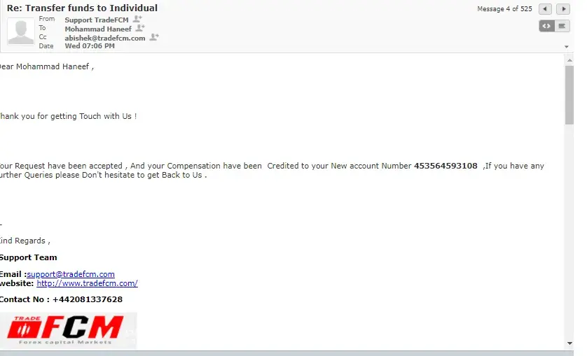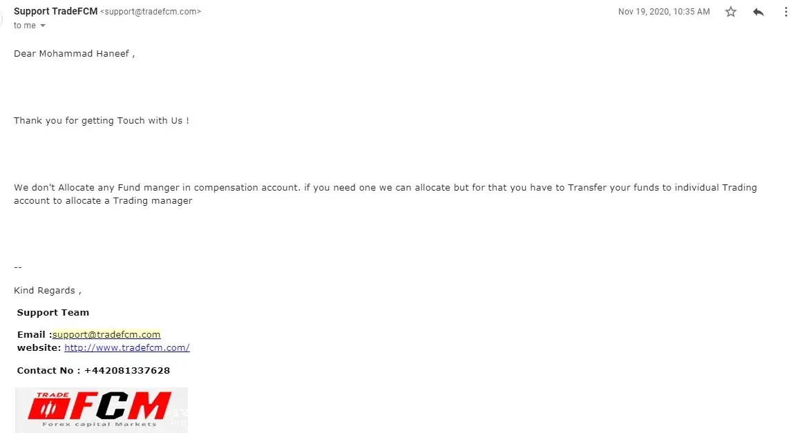 Dear Complaint board, Please find the attached mail snapshot showing the Trade FCM don't provide the fund manager for the compensation account & suggesting to transfer the balance remained after 40% loss to my initial investment. I have stepped into the company as an investor as Mr. Sam Walton provided trust to make only profits and showed the same to invest further till 6000$ & that to starting from the individual account with 10% commission on profit transfers. Now Mr. Abhishek who is the new fund manager allotted to me after continuous followups ignores & leave me saying that will trade from Jan'2021 as it is not profitable to him & his company to recover commissions. These mentors are continuously sparing most of time on the Forex trades only & they will be having knowledge or assumption of profit or loss. All at last all together left me with loss of my investment. And even my ID was blocked and not at all been accessed.