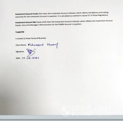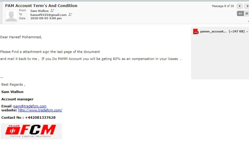 Dear Team, This is not blank & white. All the trades are done by the Fund Manager only. The signatures to be done or the copies to be sent to the Trade FCM is guided by the fund manager Mr Sam Walton. He asked to trust for the every trades done by him. This Pamm Account concept is organised by him personally. Mr. Sam Walton gave commitments on personal calls to trust him for the trades made by him only. I have to just see the performance of the pamm account. Individual account is posted with the compensation percent of 60%. The term & conditions are clearly not described with me over phone or the signature page sent to the Trade FCM is only the last signed copy where Mr. Sam Walton pressured to do in hurry in a last moment where his complaince officer is asking on regular base. I am holding all the call recordings of my fund Manager. Either till yesterday Mr. Abhishek has called me & trended me that my account will be made inactive by the company as I have raised my concern with you. I simply require my hard earned money back. The concepts of making profits & making the clients to invest showing the bonus as profits to cover levarages any body would be attracted. Mr. Abhishek who has also told me that he will send me notice at my India location & said will inform to my banks where I invested with him for profits. Either the compensation individual account is paid for me from my actual 6100$ to 5034$ pamm account & roughly 3000$ change to my never used individual accounts. I am highlighting this concern to not down the reputation of the Trade FCM but to save other people whose hard earned money may be at the risk ofcourse attractive bonusses may be shown that nil loss will be there for their money. The acceptance or the conversation mails are even been guided by the fund manager Mr. Sam Walton to forward the mail like this. The other investor Mr. Anthony & himself Mr. Sam Walton into my pamm account withdraw but with losses or to fraud me I expect the things happend with me. I am ready with all the required copies to submit with you with all the proofs having with me. Hope for better safe guard of the people, Iam writing this not for the Trade FCM fame down.