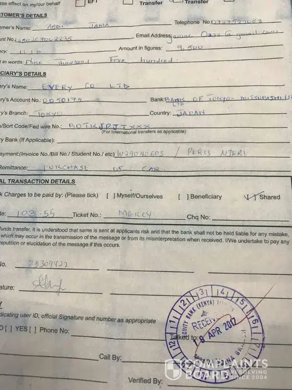 I recently used the payment service on tradecarview.com to import a car to Kenya. I sent the money to their bank account and my bank confirmed that the transaction was completed. However, trade car view Kenya did not receive the money for many days. I had to call their bank in Muthaiga twice and follow up every day. Four days later, they finally confirmed over the phone that they had received the money.