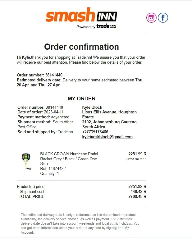 I am extremely dissatisfied with my recent experience with Smashinn. I placed an order for a Hurricane Padel Racket, Order number: [protected] on 11th of April 2023, and the package was apparently lost in transit. Despite reaching out to customer service numerous times, I received unhelpful responses and no resolution. They keep telling me that they investigating.