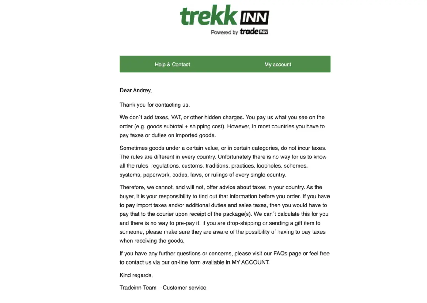 Overall, I would not recommend buying from TradeInn. It's been a very unsatisfactory and stressful experience. The customer support is inefficient and unhelpful, and it seems like they're trying to scam people out of their money. It's just not worth the hassle.