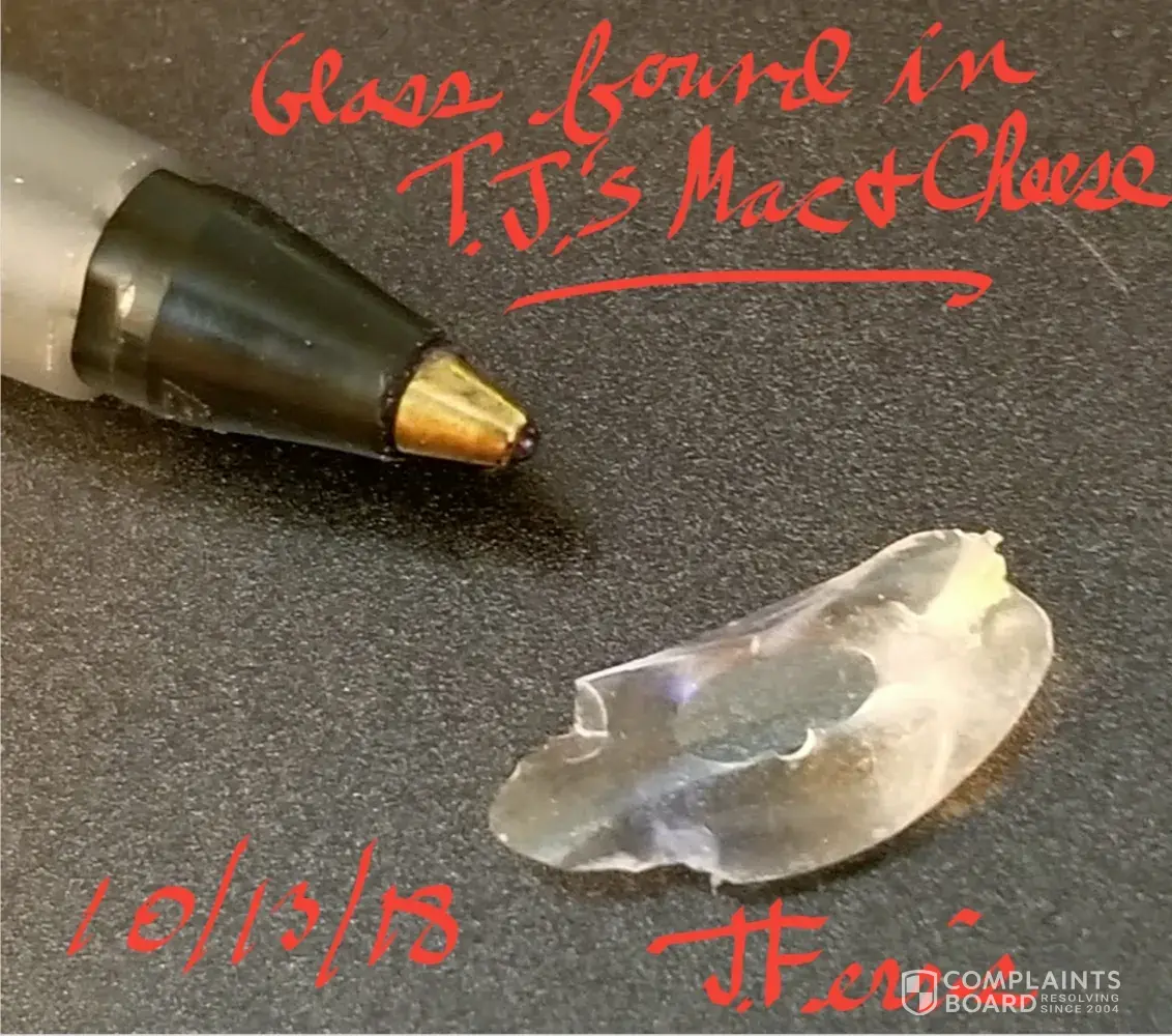 Last week, I bought a box of frozen mac and cheese. After nuking it in the microwave, I began to eat it and suddenly bit into something hard. Turned out to be a scary, jagged shard of glass. Wth? Wonder if I swallowed other pieces. They better do a recall pronto. This is the second time I've found a UFO in T.J. food. The first time was in their sweet Italian sausage.