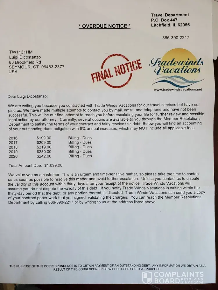 We got a final notice from Tradewinds Vacations stating that we were overdue from 2012 to 2020 in the amount of $2, 194. I thought this was a joke. But as a courtesy, I called the company asking what this is all about after 10 years later. Responds from the company representative Avi was like talking to the wall and broken tape recorder, telling me the same...