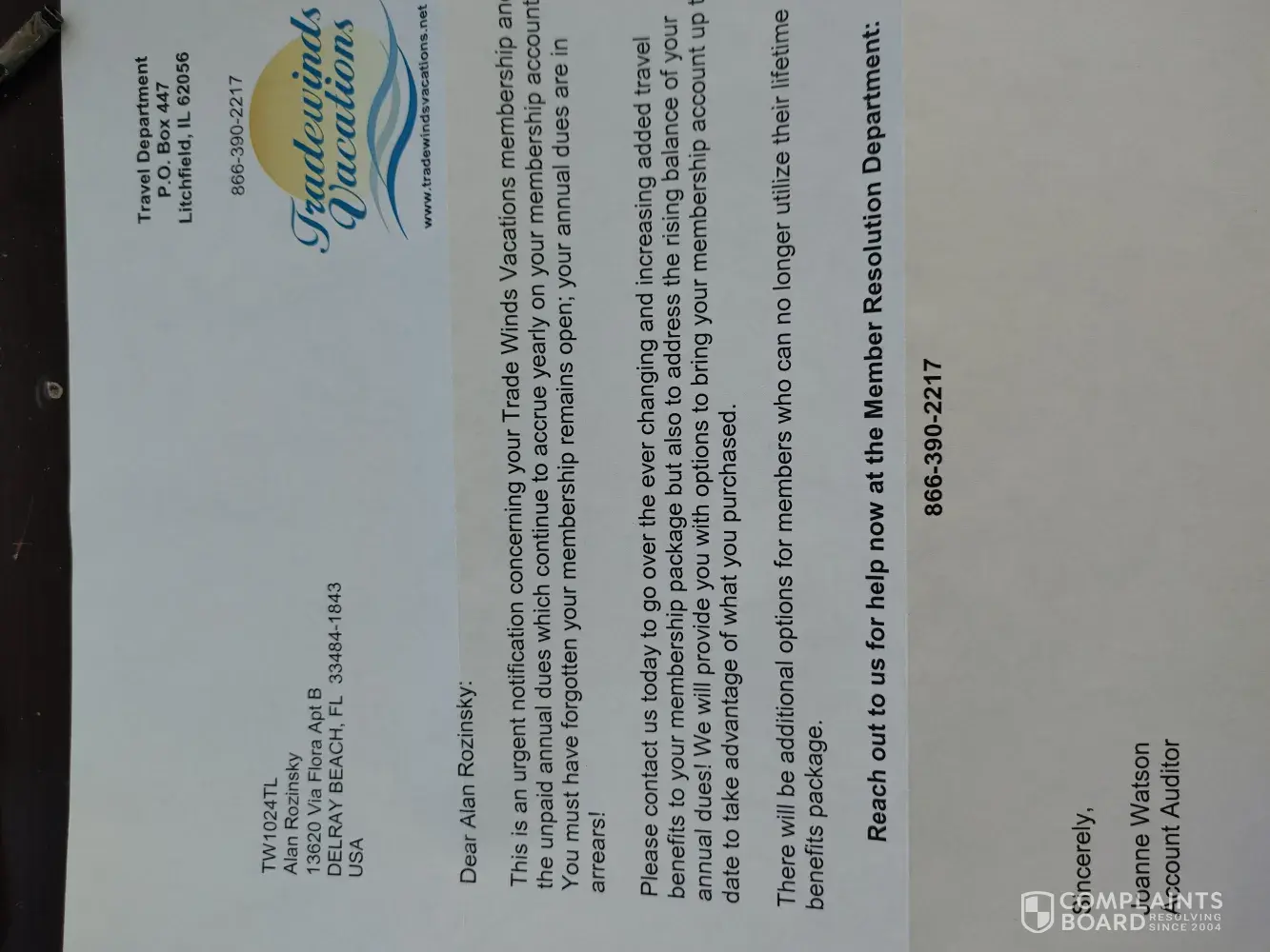 In February of 2010 we attended a Tradewinds Vacation presentation. We never used it, we were never sent a bill for any kind of dues or fees. We spoke to one of their representatives explaining that my health problems were preventing me from traveling. We came to a mutual agreement that ended our membership in 2013. For the next seven years, 2014 thru 2020, we did not receive any billing for dues, nor any certified letters, nor any voicemails… not anything! And why was that? Because our unused membership had been terminated in 2013! On 12/19/2020 we received a letter from Tradewinds demanding $1620.00 for dues from 2014 through 2020. After seven years, Tradewinds Vacations started contacting us looking for revenue. With Covid-19 raging around the world, people weren’t traveling and so their income stream must have suffered dramatically. First, they wanted seven years of dues, and now they want to “work out a finalized agreement to either settle or close the account.†This is nothing but a scam, as the account was already closed; and under Arizona law, there is a statute of limitations of six (6) years for litigation concerning written contracts.