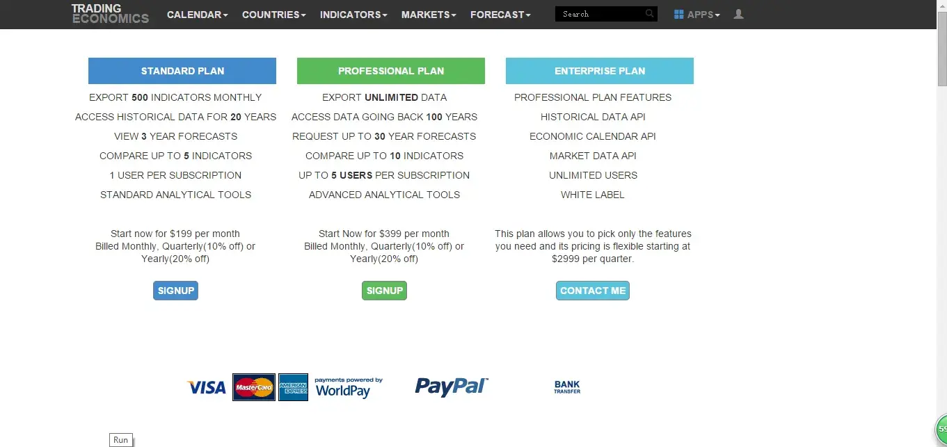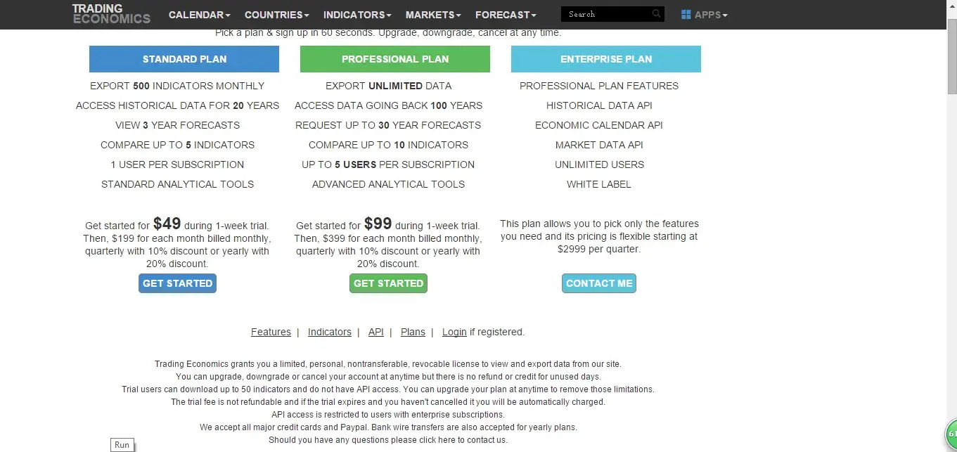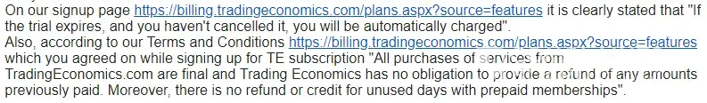 I have to say Trading Economics is a good database. Their data are well collected and presented. But they charge for very high fee and they are tricky. As you can see in PIC 3 you can see the terms. But once you paid and keep yourself remembered when logging in you will no longer see the terms (see pic 2). I believe they do this on purpose. So you will not be noticed anymore to cancel it. This is how my extra US$ 399 is paid. Really big amount! I wrote an email to say sorry that I forgot to cancel my 1-week trail but they refuse to pay me back. This is a kind of robbery!