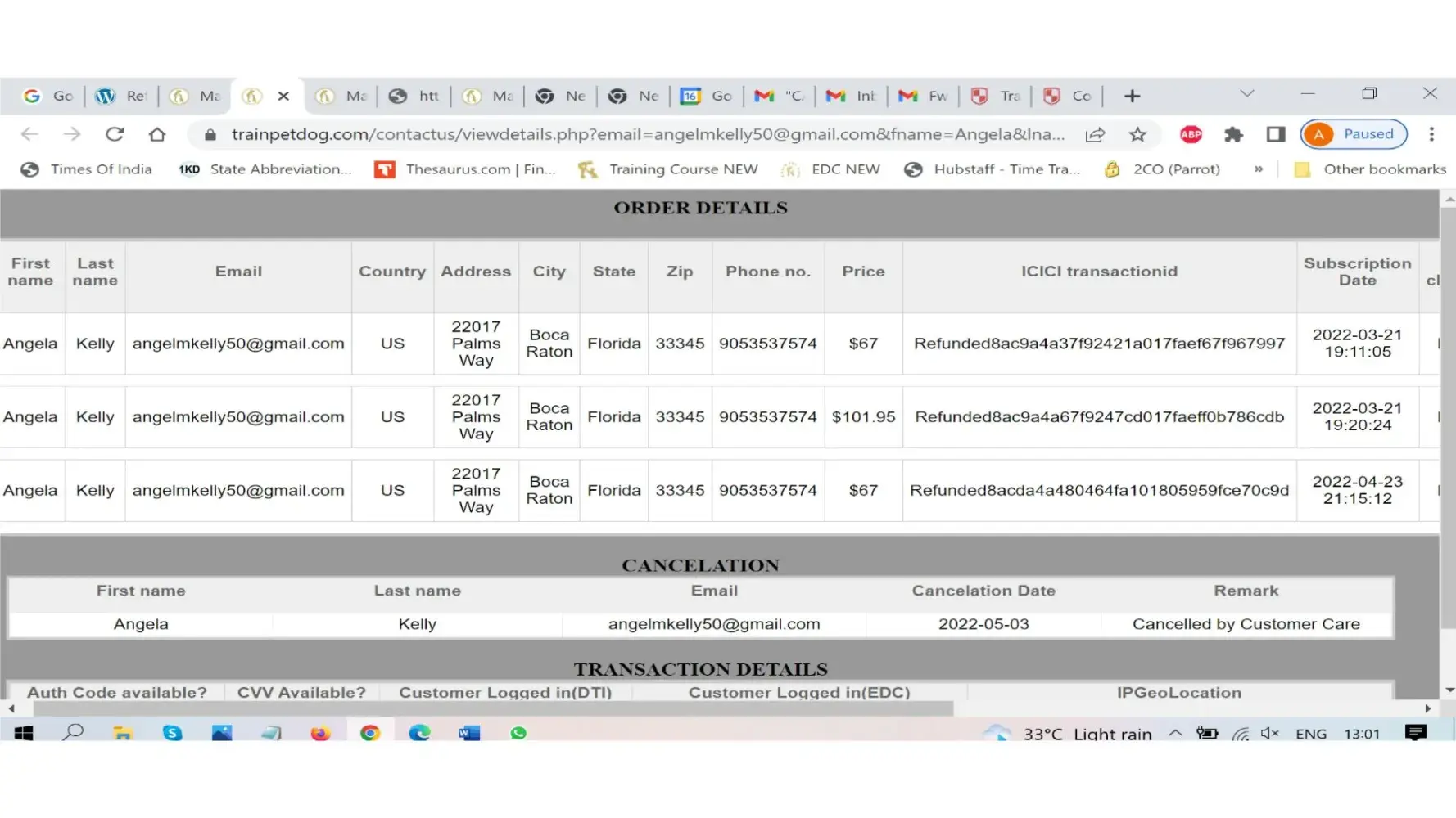 On Dec. 23 you charged me $67 x 3 for your training course. My dog died suddenly, I requested you refund my money. I never even got to use your product. I will not be getting another dog. You refunded me on Jan. 9th, only one of the charges. Where are the other two?