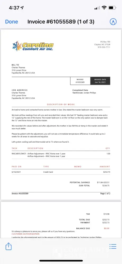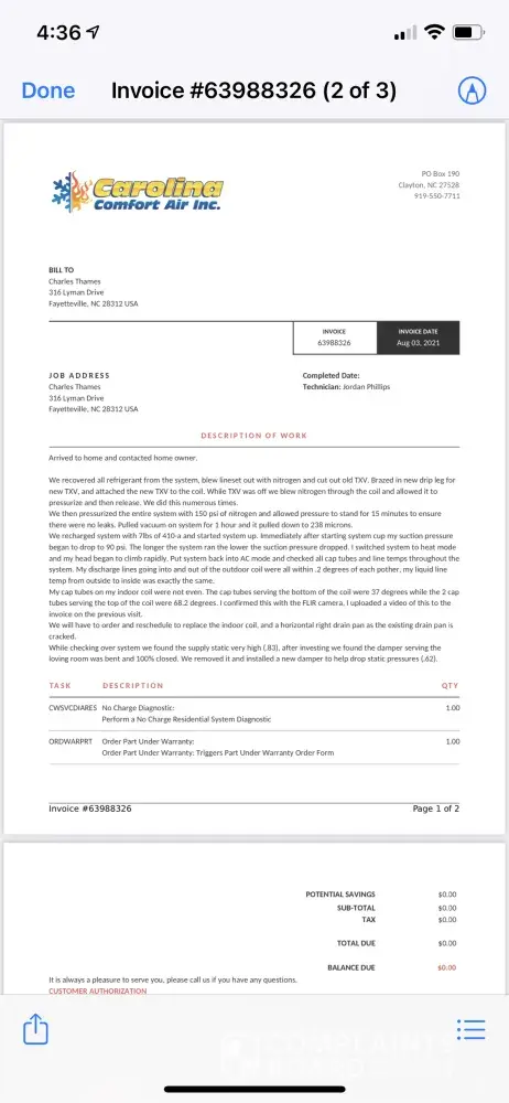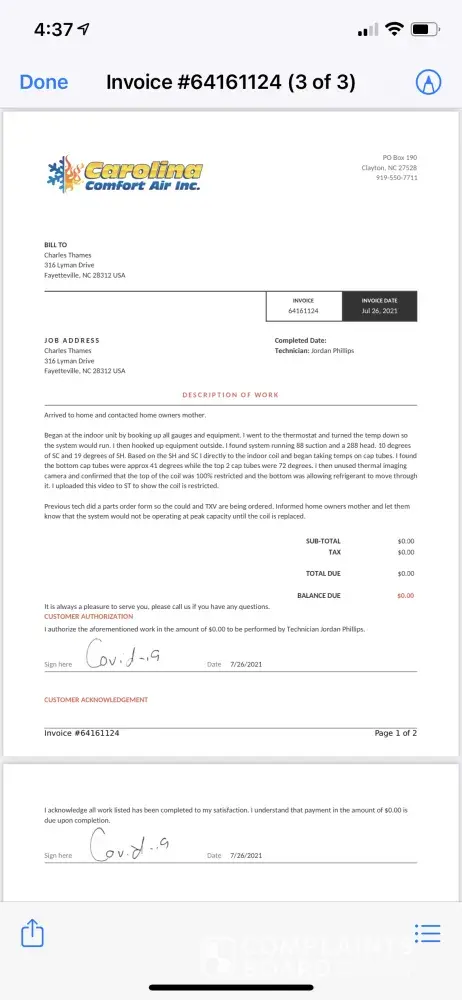 I bought new construction home approximately 3 years ago with two Trane units installed, a 2 Ton and a 2.5 Ton. By Carolina Comfort Air, NC. The 2.5 ton was having issues cooling and Carolina Comfort Air was called out. The technician discovered that the air handler coil was leaking from two factory braised spots. A new coil and valve was ordered, and installed. Upon installing the new parts it was found that the valve was restricting flow, so a new valve was ordered. Technicians came out again and now technicians say it's the new coil that was sent that is bad, so again I am stuck waiting on new parts. With the initial factory parts being bad and subsequent parts being bad my only problem is the fact that I am liable for paying installation cost of over $1500 for this fairly brand new unit with what I'm being told by techs as bad parts.