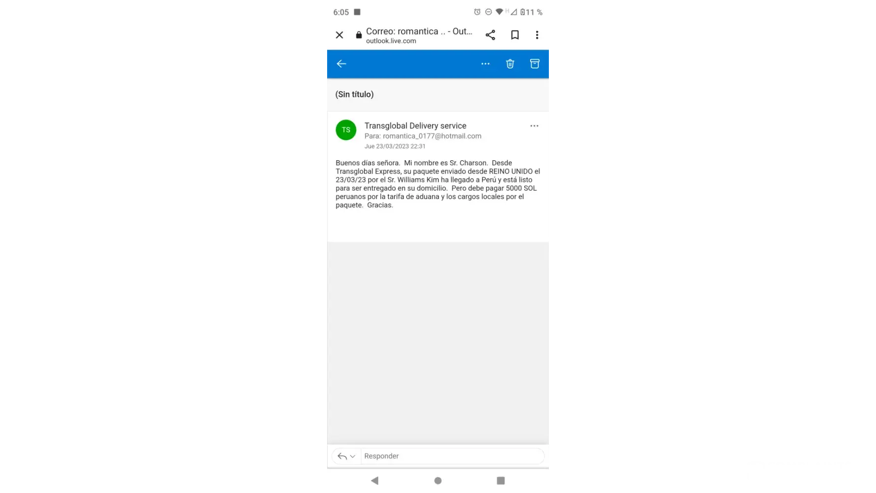Buenas tardes soy Miriam jaramillo del Perú quería saber si el mensaje que adjunto a la presente fue enviado por su empresa porque en el correo que envían toma. El nombre de la empresa global express dónde me indican que se me ha enviado un paquete con fecha 23/03,/2023 origen Reino Unido de parte Williams kim con destino a mi dirección en Perú y me solicitan que para la entrega a mi domicilio del paquete debo de realizar el pago de 5000 nuevos soles como Tarifa local espero su pronta respuesta