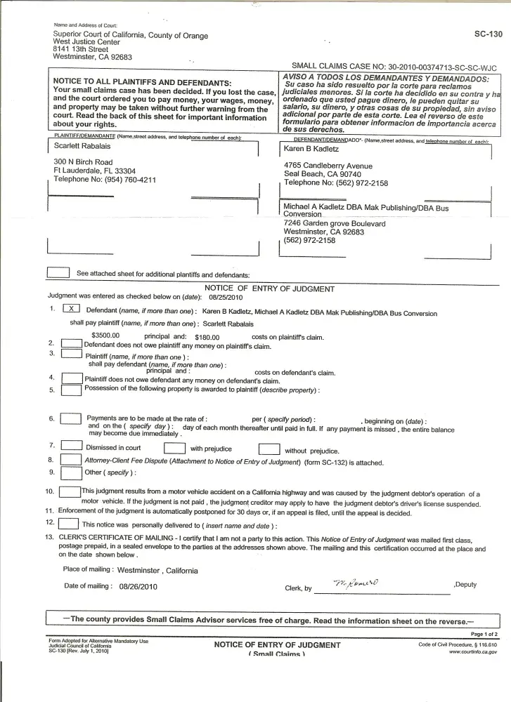 I gave Karen & Michael Kadletz 11, 500 to buy a MCI bus from them. I cancelled the deal and they refunded part of my money but I had to sue for the remaining 3500.00. I obtained a judgement on 8/25/10 in Superior Court of CA, County of Orange, West Justice Center. Case # [protected]. In my opinion these people are crooks and rip off many people and need to be...