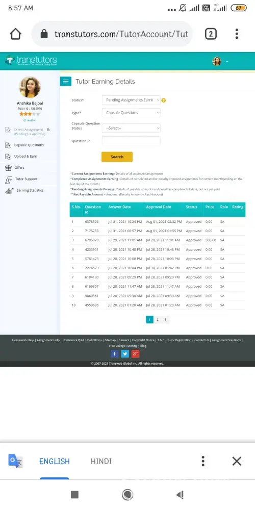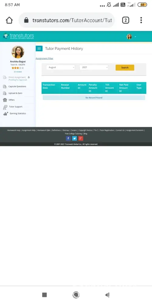 I have worked on 25 assignment requests basis which I was liable to get 21595 rupees from transtutor. But they blocked my account as well as abused me. They have a pattern... As soon as I cross a threshold of 20k... I start getting heated messages from moderators. They are doing it with everyone and as on date they have 15 to 18 questions high value orders and volume to which they fail to handle