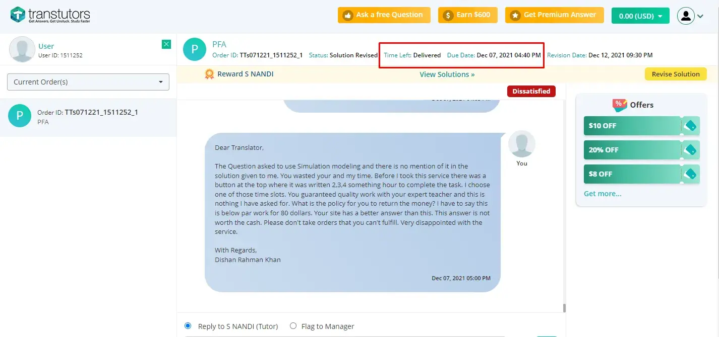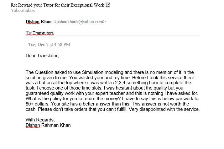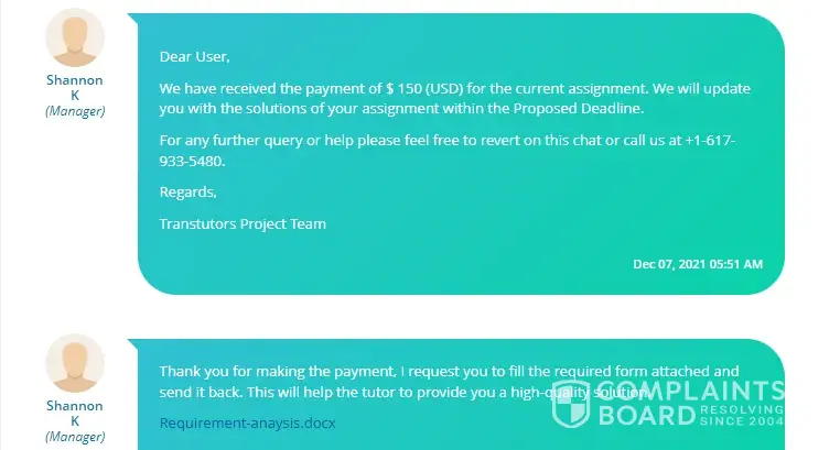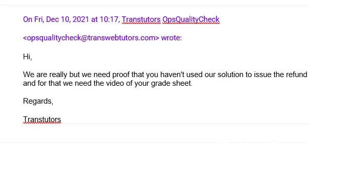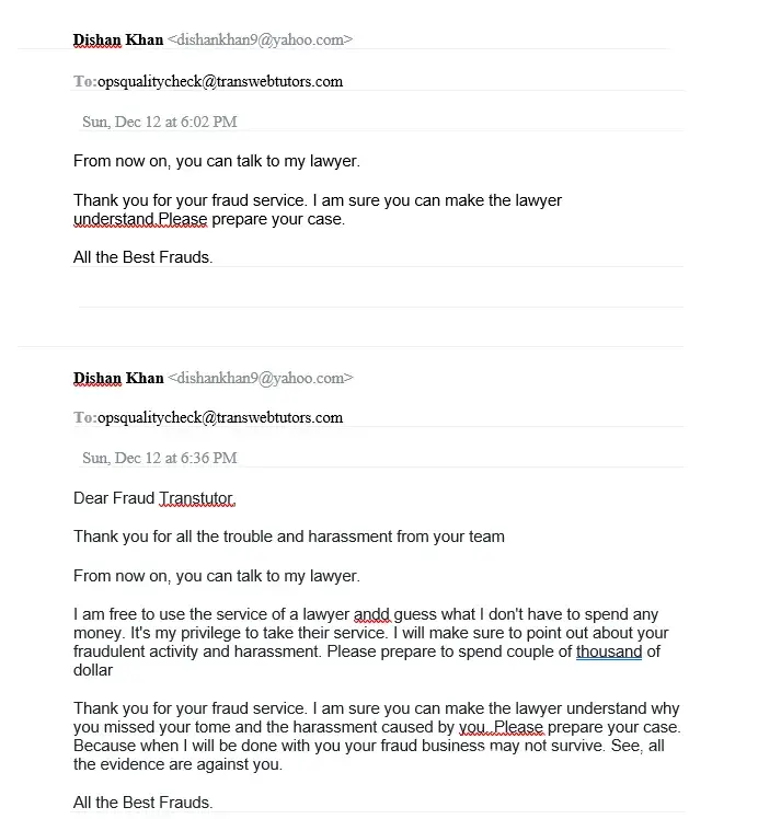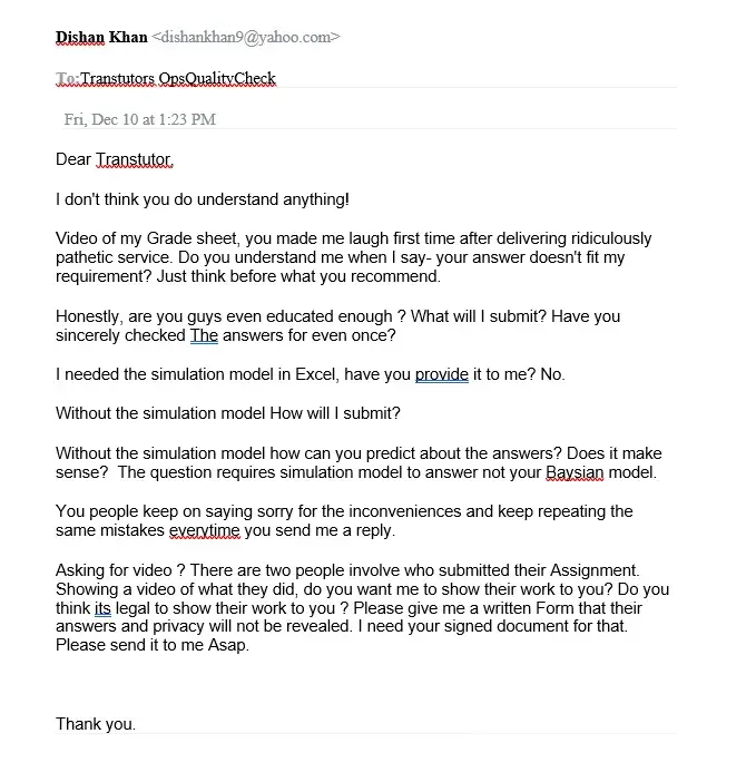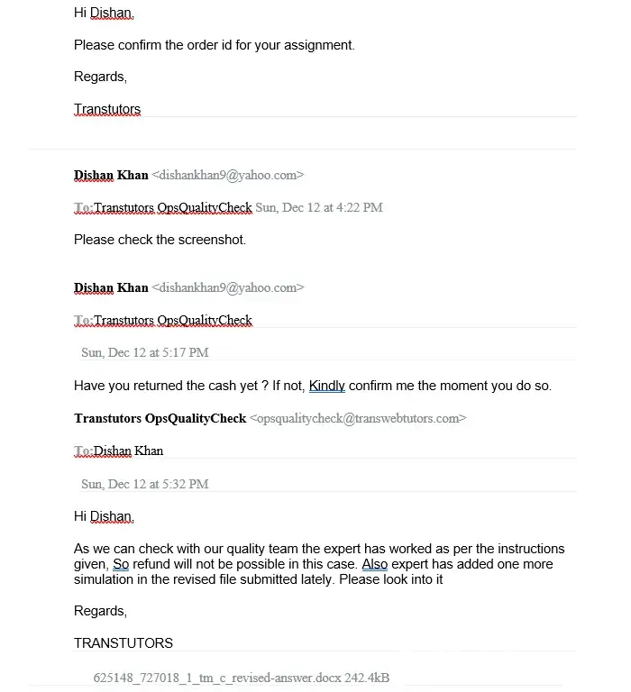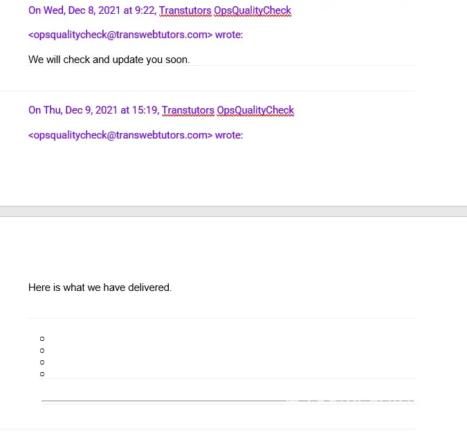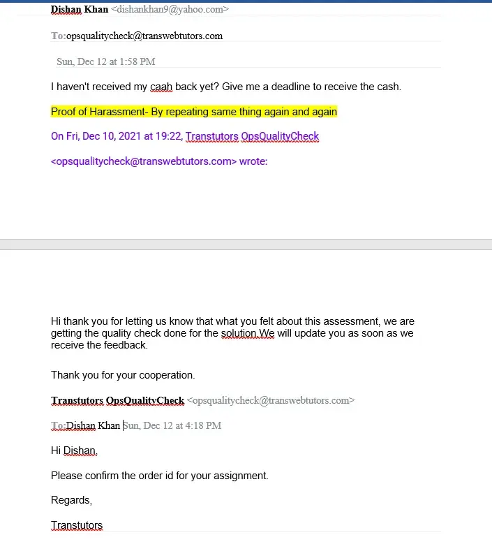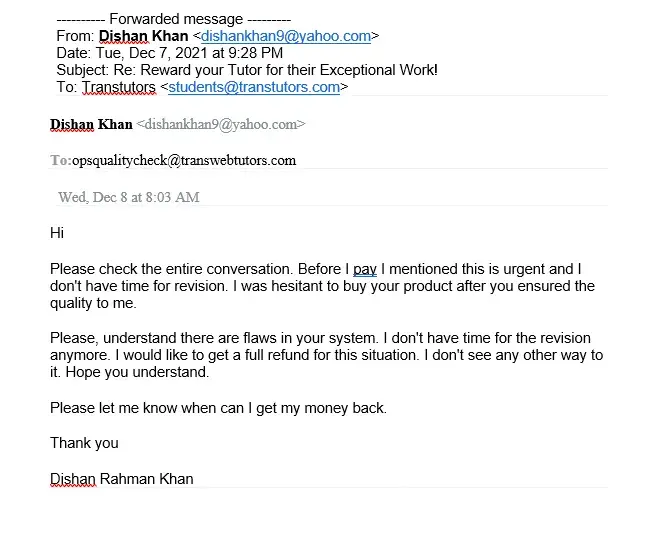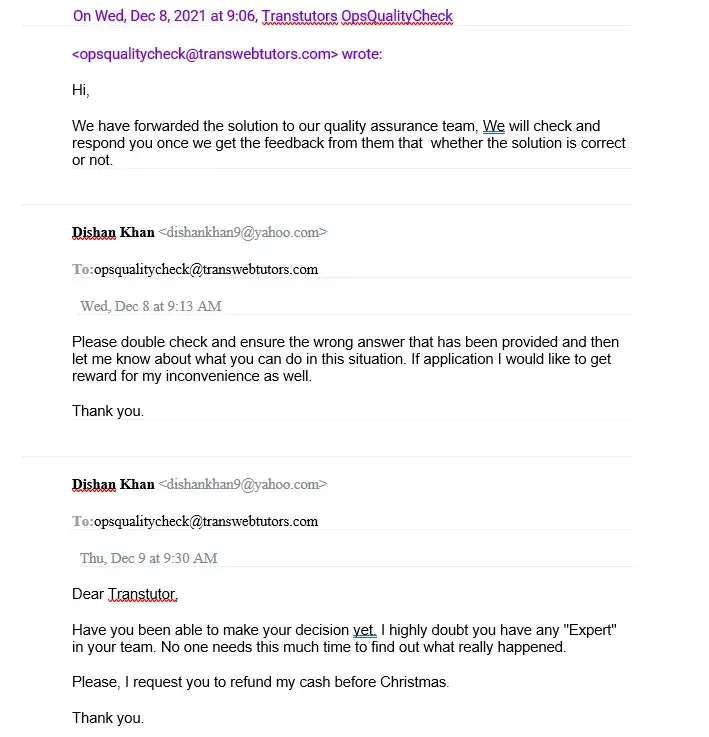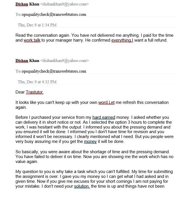 Then they continuously send me email to send rewards to the teacher who has submitted non-relevant answers. After much harassment and negligence from Frauds Transtutor Team, at one point, they agreed to pay the refund. Now after 5 days, where the deal was supposed to be completed in 2 hours they are saying they will not refund any money as they have submitted the Excel sheet. Before they take the payment they were aware of the limited time and urgency. They are fraud with above 7 Managers. Every time someone else was sending me a message. Please take action against these fraud scammers who took my money and did not fulfill the service on time. I want my full money back and reimbursement as well. Looking forward to your justifiable justice.