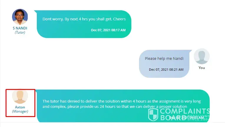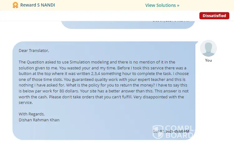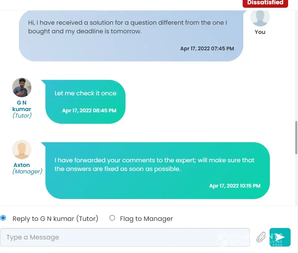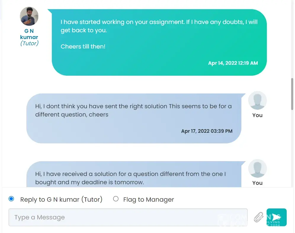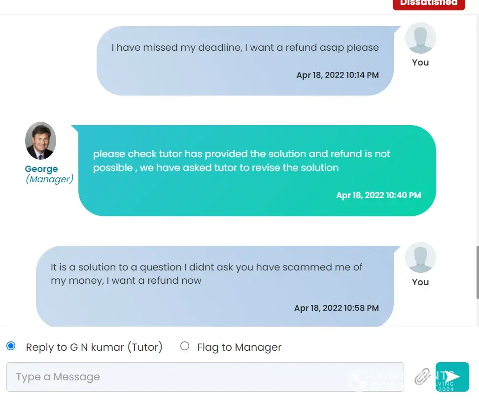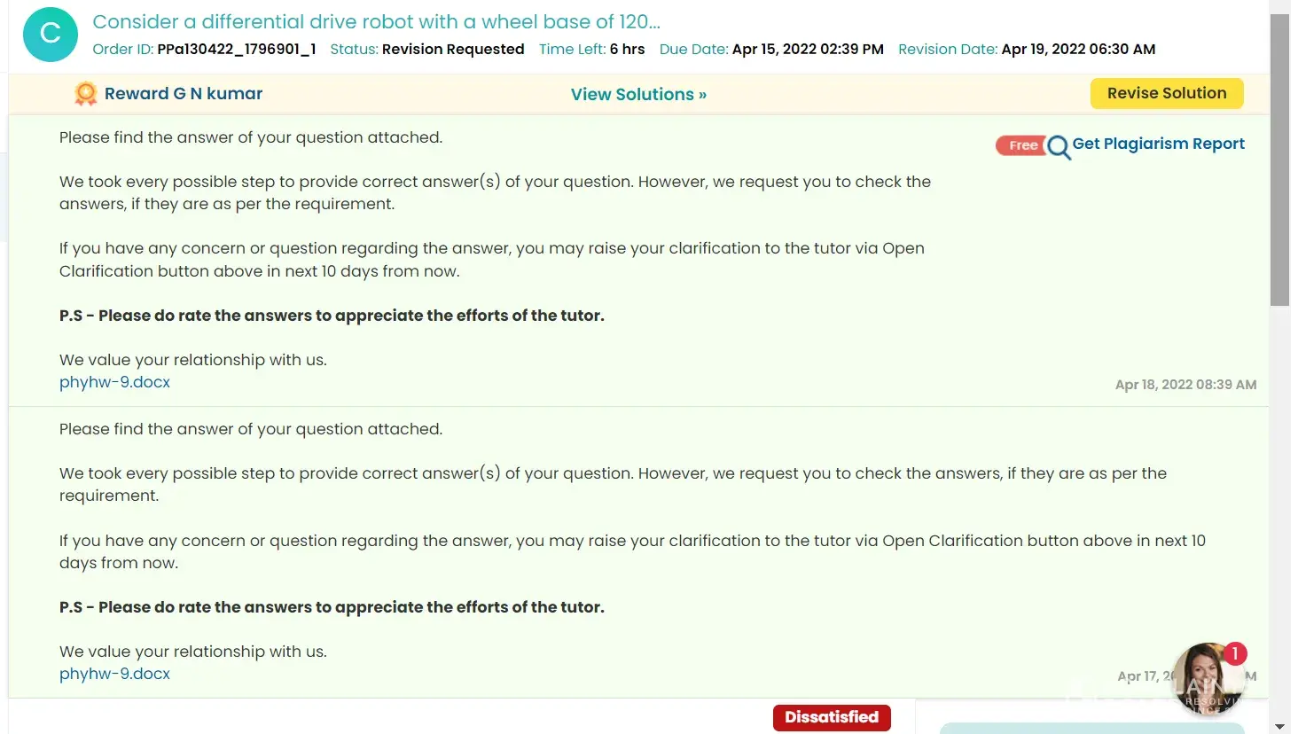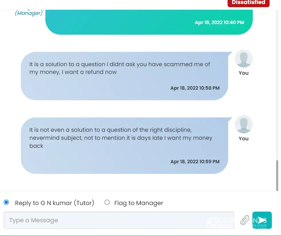 On the 17th April, so 4 days late, I received a solution for a completely different assignment in a different field. Even someone with no background could tell considering my solution was a coding robot project, and what I got sent to me was hand written maths to dynamics of a rod. Even the number of questions were not the same. I said to the tutor and flagged to the manager that this was the wrong solution and they said they would revise it. I was then sent the "revised" solution Iater that day, which was the exact same as the previous one. Now my deadline has passed, and I have still not received the right solution which is completely pointless to me now. I have emailed and sent messages but they are now claiming they cannot refund me despite still having not even delivered what I paid for, nevermind in the 24 hour deadline I paid for, which clearly violates their own terms and conditions which states a refund can be granted if " If the tutors and experts are not able to meet the deadline for your work (barring the insignificant delay up to 10% of the last agreed deadline), given that you have provided all the details and sources without delay." As can be seen in the screenshots, the fiIe is even IabeIIed physics homework, and as stated previousIy, my question was programming and robotics.