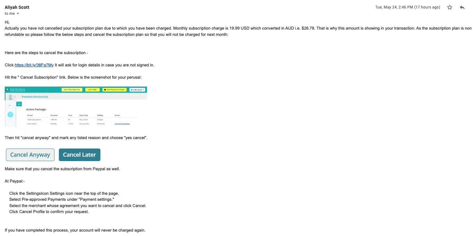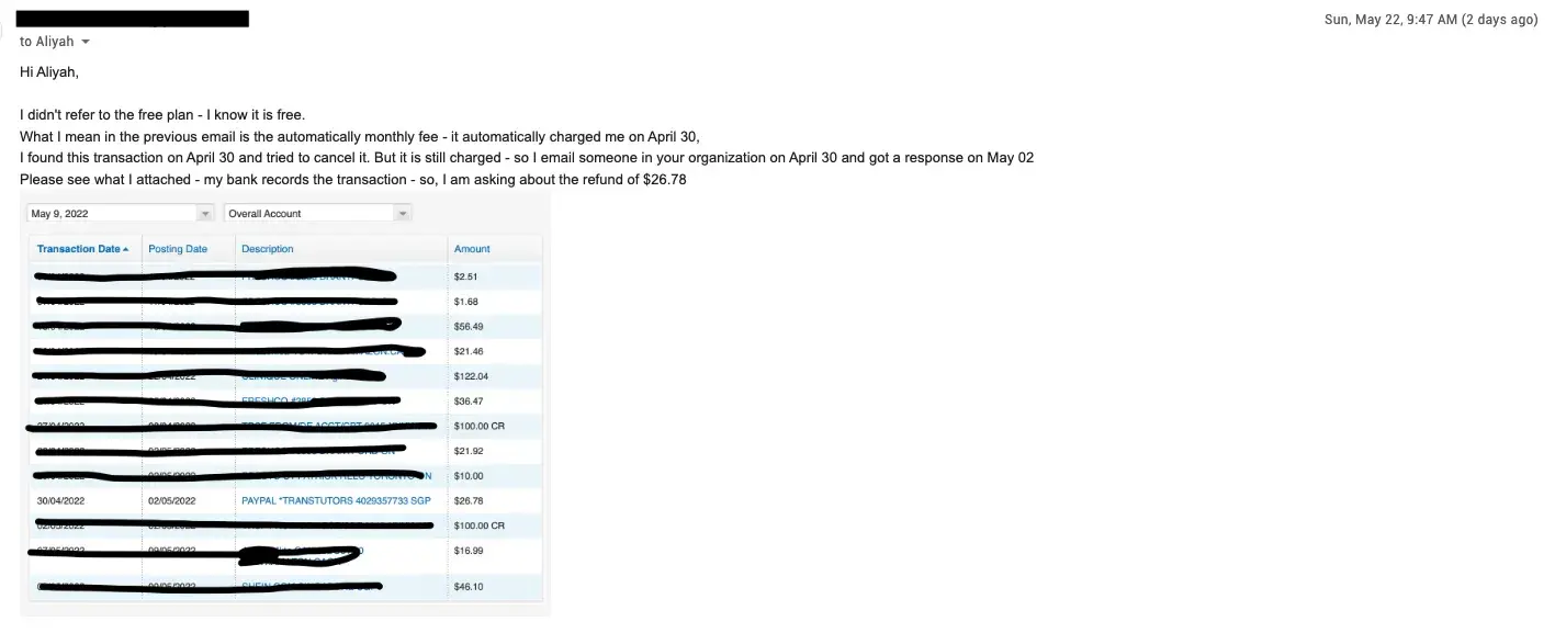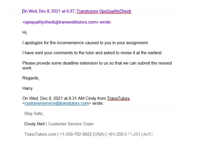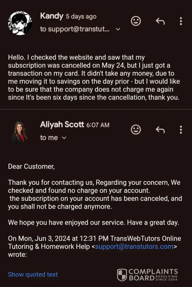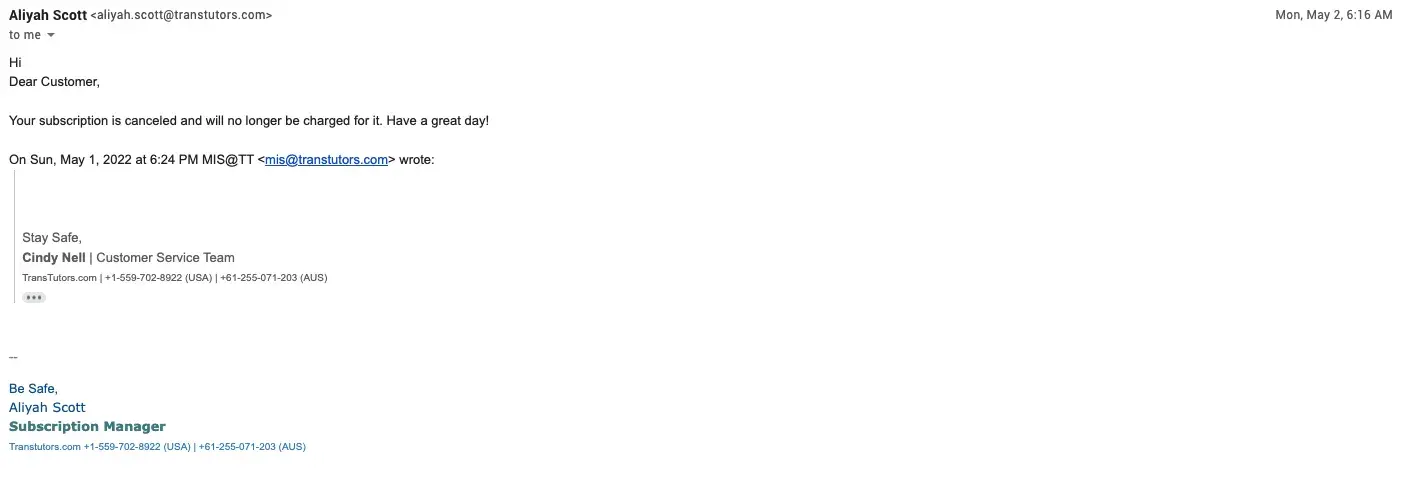 I logged in and cancelled on April 30 (the same day) and for double-checking - I contacted the live chat to ask if I can get my refund as it is shown as processing in my bank. The live chat said if I can get a refund if I emailed them within 24 hours. I emailed [protected]@transtutors.com and [protected]@transtutors.com. on April 30.