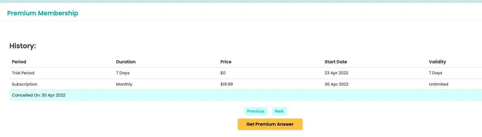 I registered to transtutors to see the question that might help me with my grade. I entered the free trial of 7 days period and i wanted to cancel it. To my suprise when i refreshed the page it showed that i have no premium membership and no acces to any questions. I gave up and wanted to cancel this membership but there was no option for it. I emailed transtutors support and they emailed me back late at night the day before i was supposed to pay for the next month that my membership was cancelled and i will no longer have to pay them. To my surprise todayi got an email saying that i got 19.99$ deducted from my account. I tried to contact them, no response for now, but overall it's just a big scam. I specifically contacted them 6 days before my next payment was due that there is no way for me to cancell the membership and they said that they cancelled it and that no money will be taken. Very upset by this situation and i hope they will resolve it.