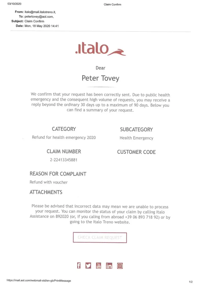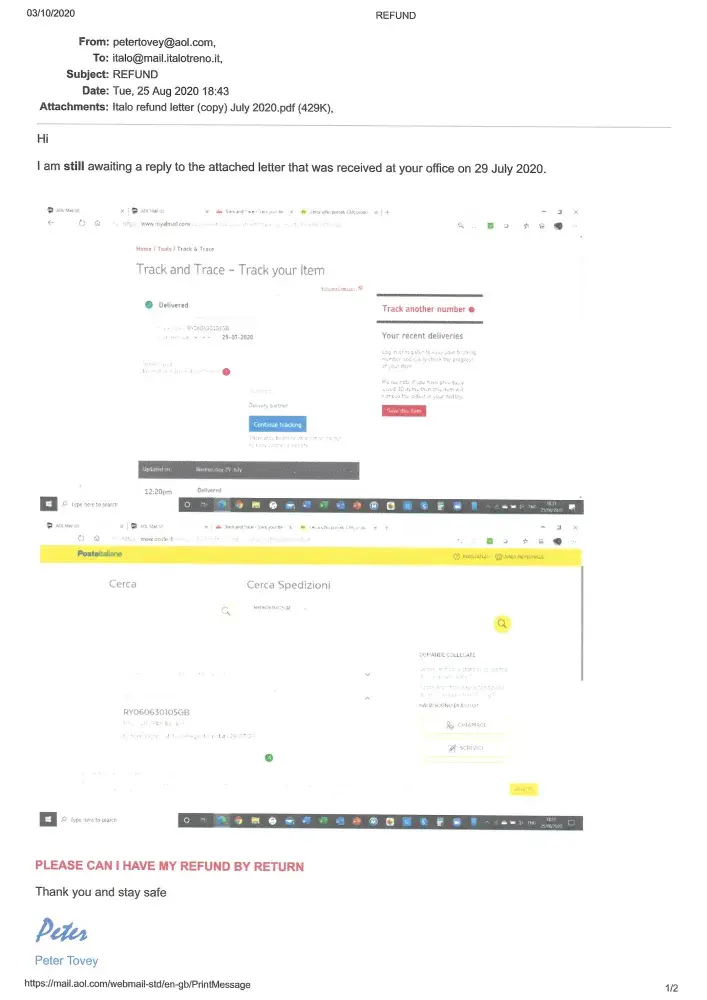 Read full complaintItalo - Nuovo Trasporto Viaggiatori S.p.A - Refund