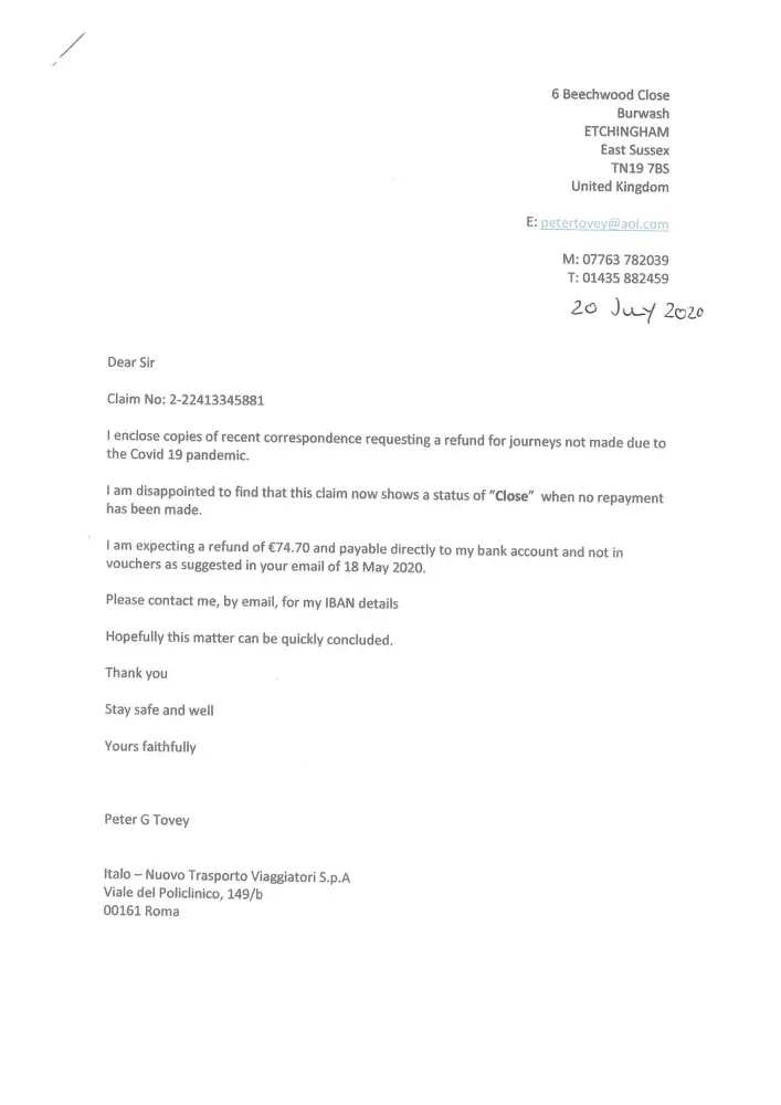 1. Trip to Bologna in March 2020 cancelled due to Covid-19 2. Applied for a refund of €74.70 in respect of 3 tickets to travel from Bologna to Florence on train 8953 (Ticket no: E52KPY) 3. Claim allocated case number 2-[protected] 4. Despite several email chasers and letters including one sent "Signed for delivery" still no reply or refund 5. Claim i...