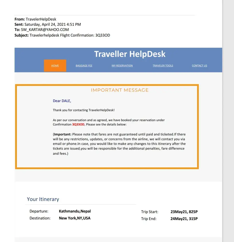 TravelerHelpdesk is a scammer there is no doubt about it. I had purchased an air ticket in April for my son, who is in Nepal. The flight was scheduled to take off on May 23rd, but due to Covid, the flight got canceled. I wrote emails to TravelerHelpdesk to inquire about, but they won't respond to my email.