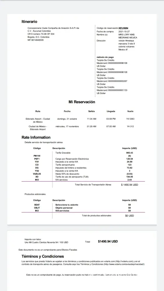 Jenny Hernández On October 26 2021 I bought 3 airplane tickets from Bogotá Colombia to Mexico city on the web page cheapfaresnow for $1, 579.00 dollars with the confirmation number 130758 I received the confirmation email also from the bank the confirmation of the money being withdraw from the credit card. But never got my reservation number on the next...