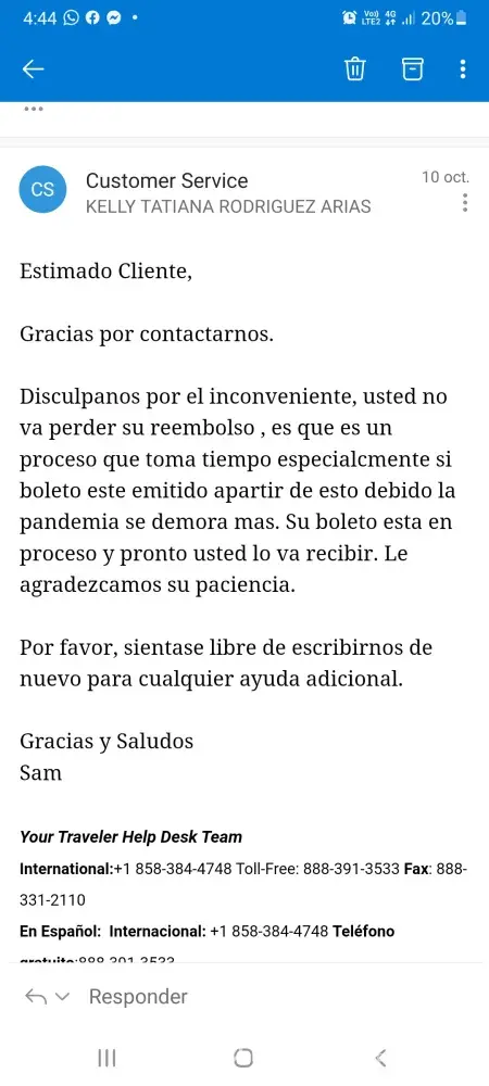 El dÃa 3 de marzo de 2020 compré 4 boletos (bogota-miami) los cuales por la pandemia no se pudo realizar, me llamaron que para cancelar los vuelos debÃa pagar una multa de 25 dólares cada uno y que se me devolverÃa el 100% del dinero. En el mes de enero de 2021 solicité a la aerolÃnea American Airlines el reembolso y asà lo hicieron el total(100%) del dinero hicieron la devolución a las tarjetas de la empresa... llevo 10 meses esperando me devuelvan el dinero o me den un bono para comprar otros vuelos, pero ahora cada vez que llamo y digo la palabra reembolso me cuelgan y responden que espere que esta en tramite.