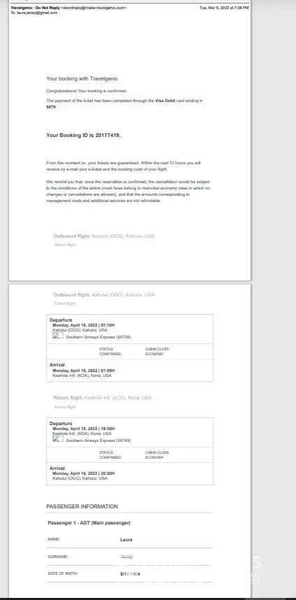 information. The lady with Travelgenio, hung up on us. The Mokulele contact then advised me