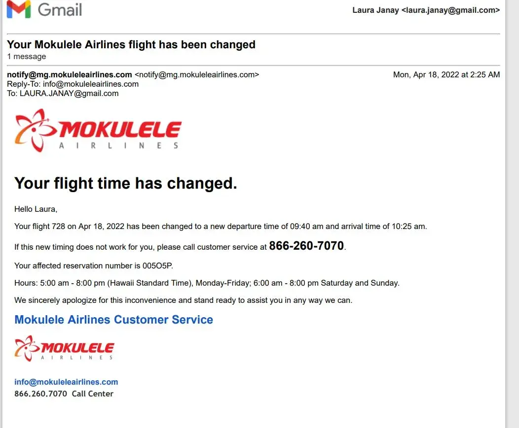 could cancel and get a full refund as the new flight time did not work for us. Mokulele advised