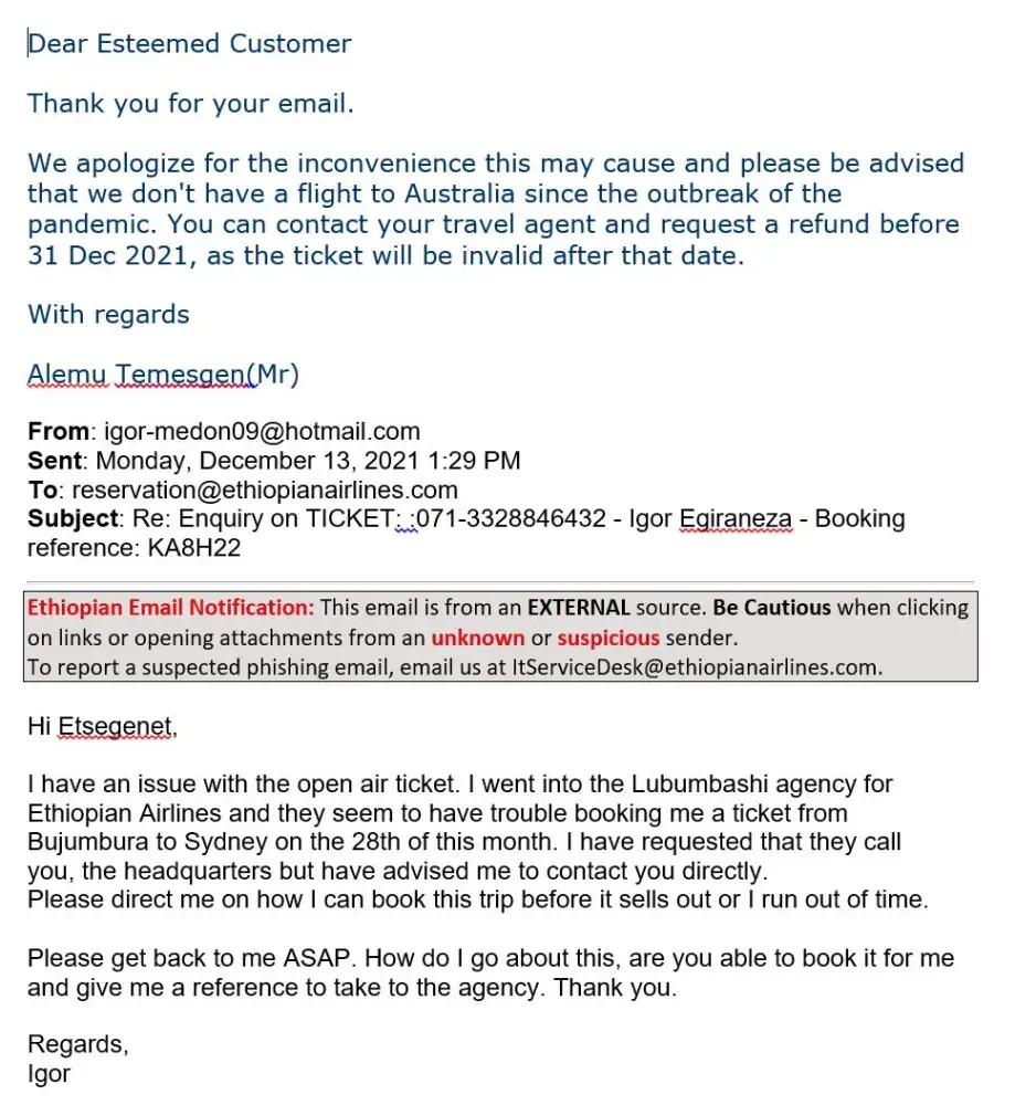 I had a flight booked with Travelgenio reference KA8H22 and ticket number 071-[protected]. The flight was cancelled and a refund was in order. Later on I was told they couldn't do a refund for me and I had to contact the airline directly. I contacted the airline directly and they advised they'll give me an open air ticket to use anytime within one year.