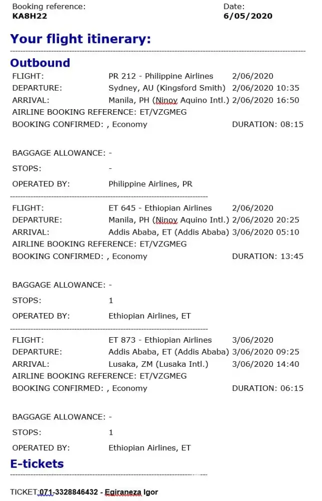 My booking was confirmed by this agency with flight details and flight tickets numbers for all passengers and both inbound and outbound flights.