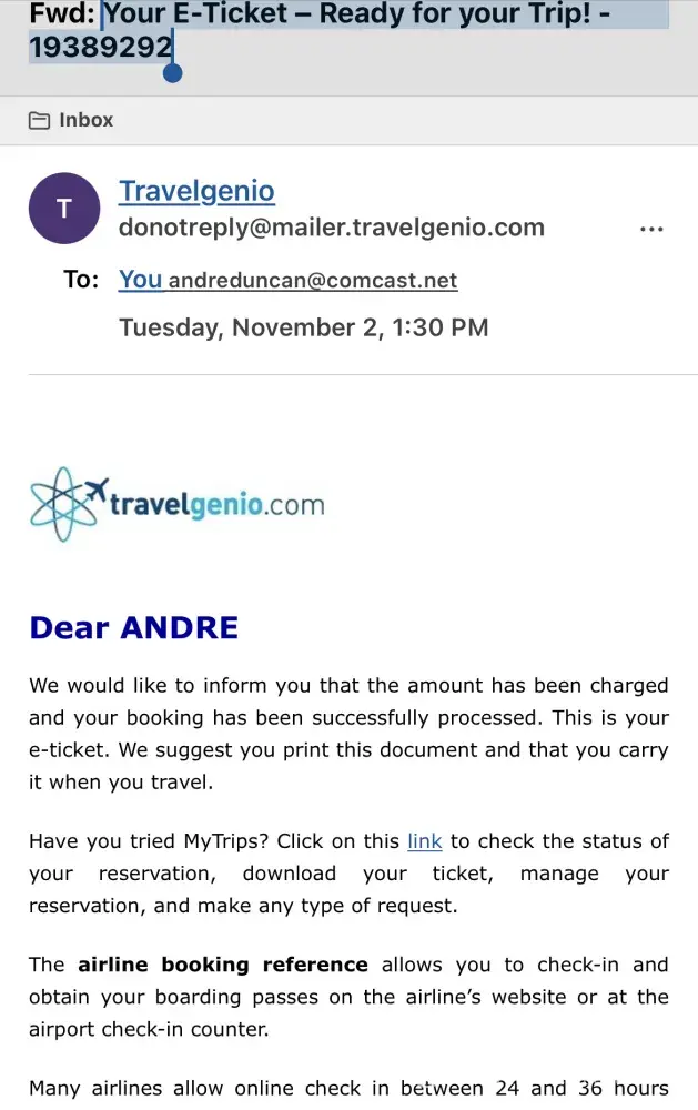 I purchased two air travel tickets supposedly on Cayman Airways via Travelgenio on 1 November 2021. On 2 November 2021, I received a "confirmation" email titled "Your E-Ticket - Ready for your Trip! - [protected]" with the supposed Cayman Airways confirmation code/record locator and the numbers for the e-tickets I purchase for US$1, 387.10. The date of travel was set for 26 December 2021, from Miami International Airport to the airport on Grand Cayman Island.