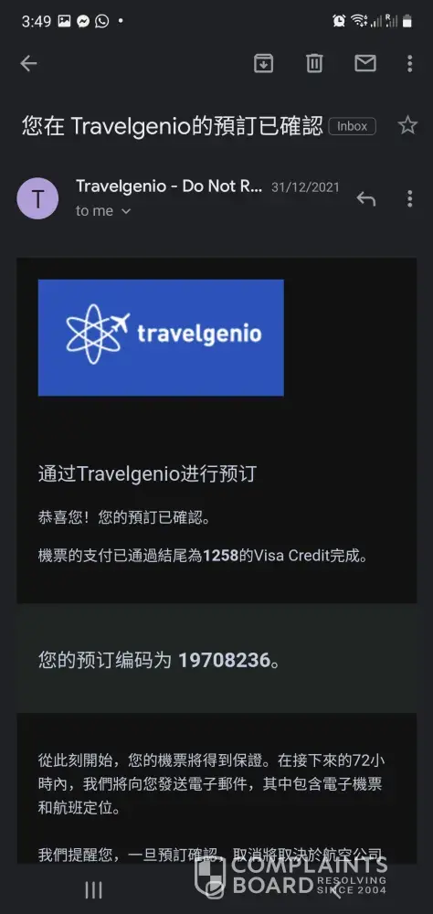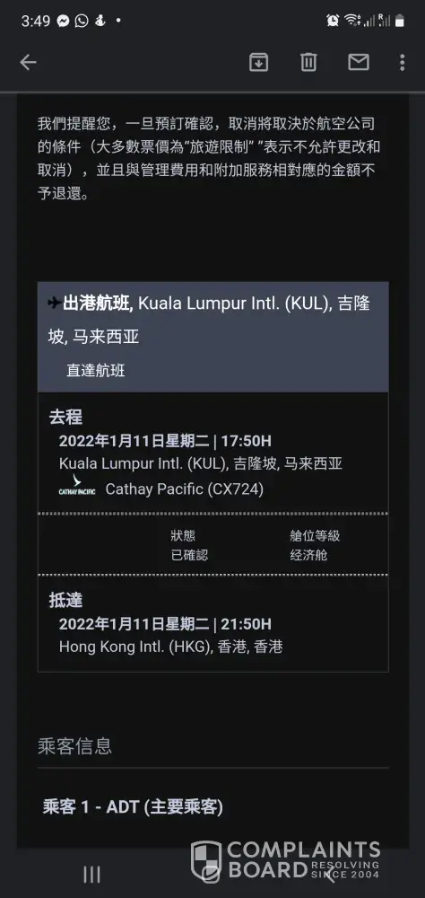 I booked a flight from Kuala Lumpur, Malaysia to Hong Kong on Travelgenio's website yesterday. Travel dates are 11th Jan 2022.Â