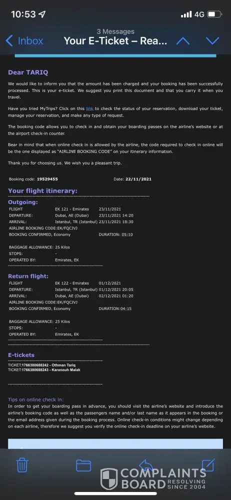 Desired outcome: Answer the phone. If I have problems boarding tomorrow, refund my tickets.
