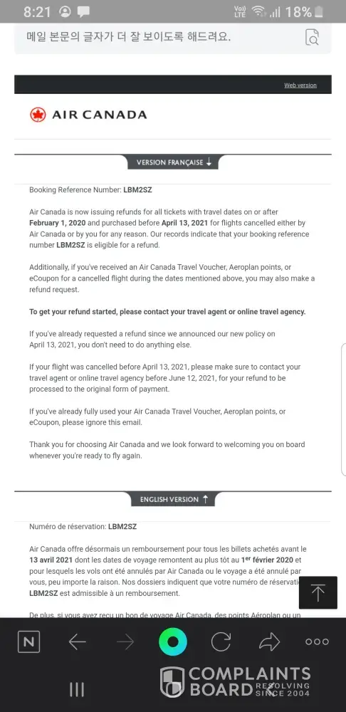 Booking Reference Number: LIXX2H Air Canada is now issuing refunds for all tickets with travel dates on or after February 1,  2020 and purchased before April 13,  2021 for flights cancelled either by Air Canada or by you for any reason. Our records indicate that your booking reference number LIXX2H is eligible for a refund.Additionally, if you've received an Air Canada Travel Voucher, Aeroplan points, or eCoupon for a cancelled flight during the dates mentioned above, you may also make a refund request.To get your refund started, please contact your travel agent or online travel agency.If you've already requested a refund since we announced our new policy on April 13,  2021, you don't need to do anything else.If your flight was cancelled before April 13,  2021, please make sure to contact your travel agent or online travel agency before June 12,  2021, for your refund to be processed to the original form of payment.If you've already fully used your Air Canada Travel Voucher, Aeroplan points, or eCoupon, please ignore this email.Thank you for choosing Air Canada and we look forward to welcoming you on board whenever you're ready to fly again.