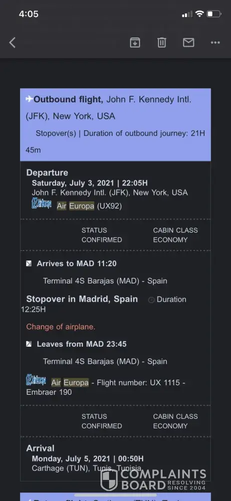 On May 5th, 2021, I bought a round-trip ticket from New York to Tunis. They sent me an Email with all the information that shows the details of my flight, from having a lay-over in Madrid and then from Madrid to Tunis. However, I called them yesterday June 12th to clarify the baggage details and everything. They told me that they don't have a flight from Madrid to Tunis and that the only option for me is a refund that I would receive in 3 months. This didn't make any sense to me since I was supposed to leave on July 3rd. I'm a student going to visit my family and that was the only money I have. Even when I look for a ticket now the prices are very high since the date is near. The representative was very rude to me and told me that they can't help in any way and that they don't really care. Please help me out with this I attached the Email that I received from them. Thank you!