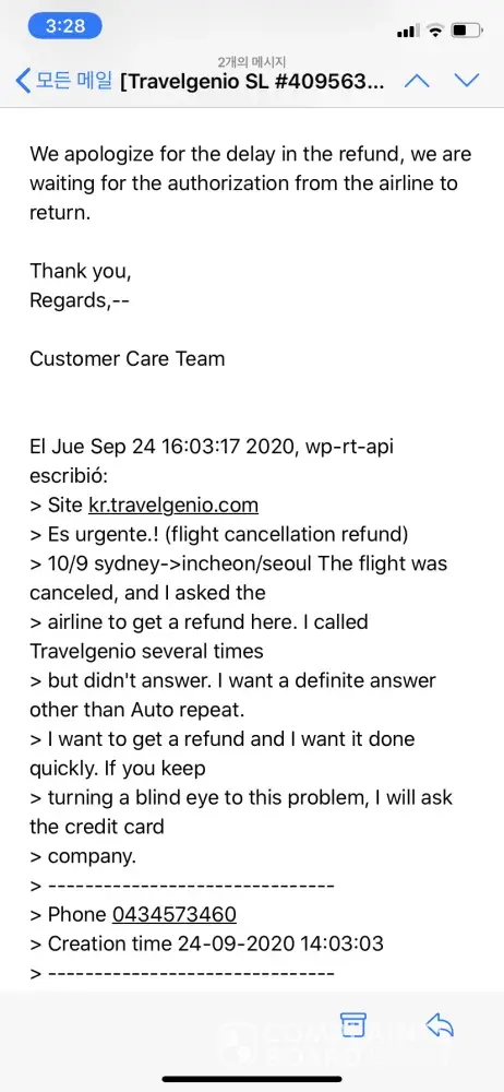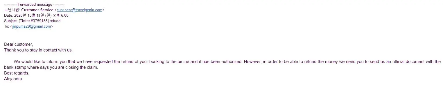 It started in March and has not received any reply so far, and it is a disappearance that has been unable to travel due to Corona 19. The last time it was said to be a refund request, I would appreciate it if you could arrange it as soon as possible.