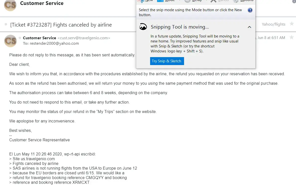 I have received several emails from travelgenio, regarding my trip; yet every time I try to contact them either by phone or through the website, I either get hung up on, or cannot find contact information for them. Now I just received an email, august 4 2020, stating,