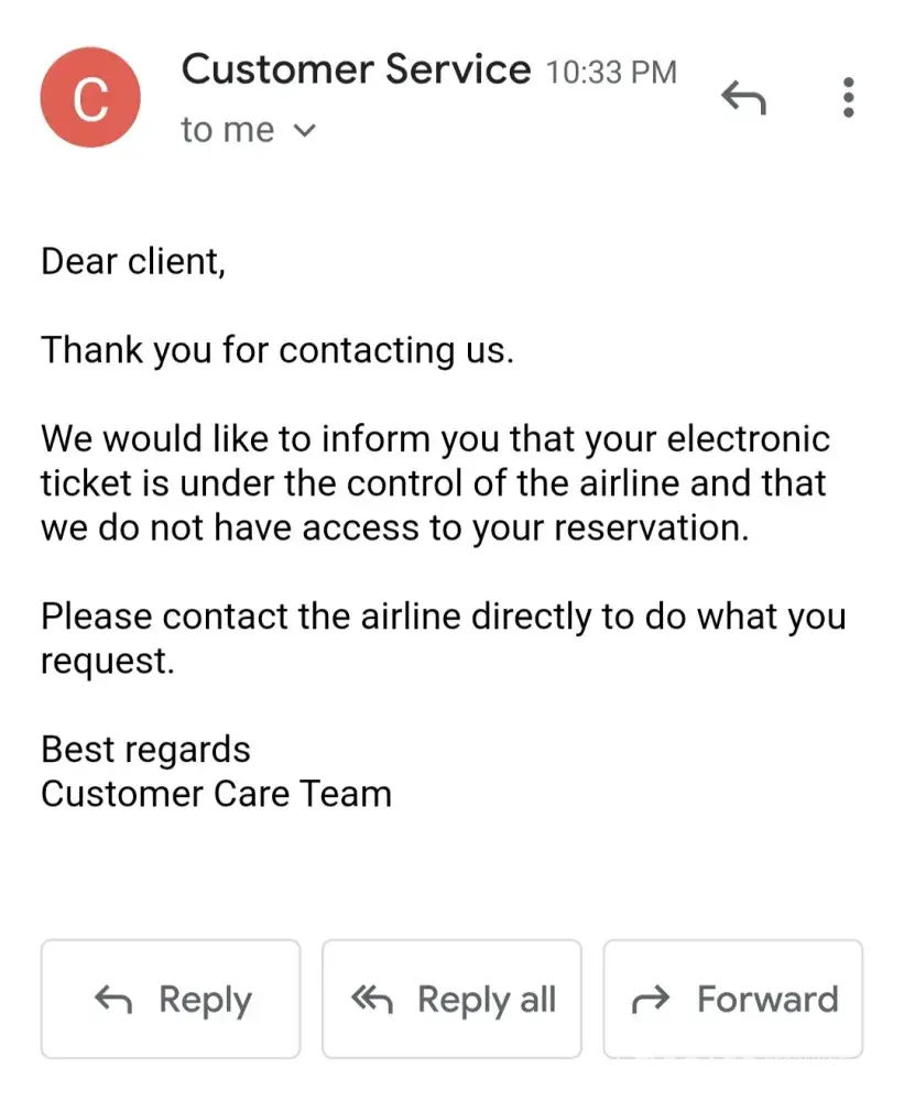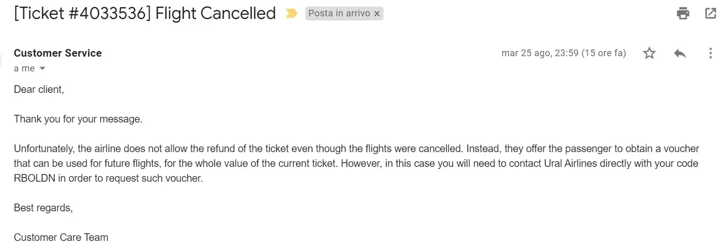 The mass cancellation of flights due to the spread of COVID-19 has led to a significant increase in the number of requests we are receiving. For your piece of mind, we inform you that your request is registered on our system and will be handled by one of agents as soon as possible.