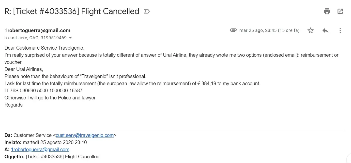 I asked and wrote to travegenio and ural airlines the reimbursement after the cancellation of flight.
