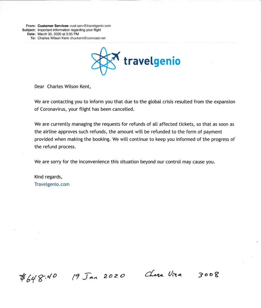 On March 30, 2020, I received notification from Travelgenio that my flights for my wife and I on SAS SK4496 from Oslo to Svalbard on 2 Aug 2020 was cancelled. We had paid $648.40 on 19 Jan 2020 for these flights. The tickets booked through Travelgenio were [protected]-[protected] for Charles Wilson Kent and [protected]-[protected] for Mary Mederios Kent.