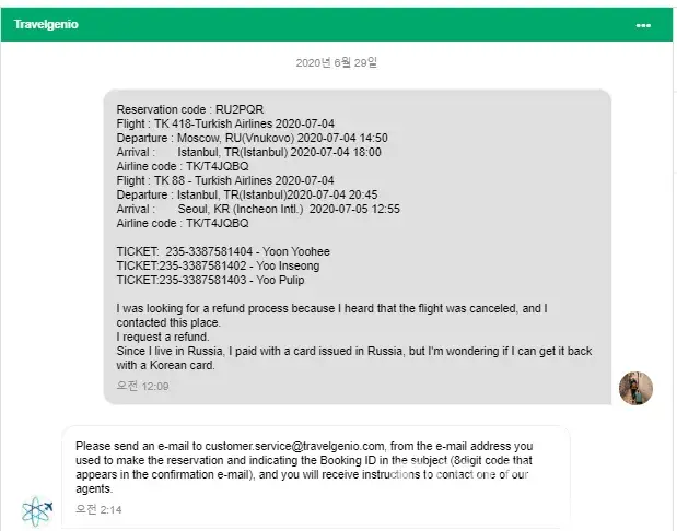I made a reservation through Travelgenio. However, I heard that it could be refunded due to the COVID-19, and consequently the flight schedule has been canceled. I tried to get in touch you by e-mail, but you never respond. Again, My flight information is as follows; TICKET: 157-[protected] Reservation code: W2PN4Z departure date & time: (Incheon Intl.) [protected]:25 * QR 859 return flight information: QA (Doha Intl.) [protected]:25 * QR 328 I regret to inform you that due to the current pandemic, I have no choice but to cancel my booking. I tried to reach you several times, but you never answered. Please let me know when I can get refund or the scheduled date for refund. As I told you, I e-mailed you several times, so it would be better for you to try to look for the e-mails that I have sent. I want you to reply at your earliest convenience.