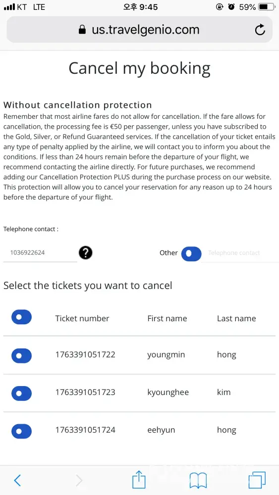 I called to airline to cancel the ticket directly, but airline said 'need calcel request from Travelgenio'.