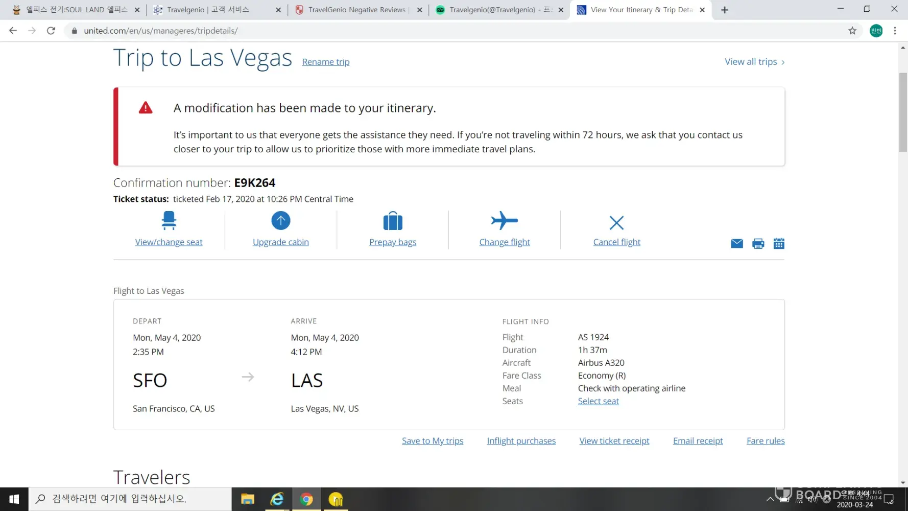 On December 18th, 2019, Japan time, I used a credit card to purchase an economy class ticket of China Eastern Airlines MU776 on March 19, 2020 on the Japanese version of the website of Travelgenio.