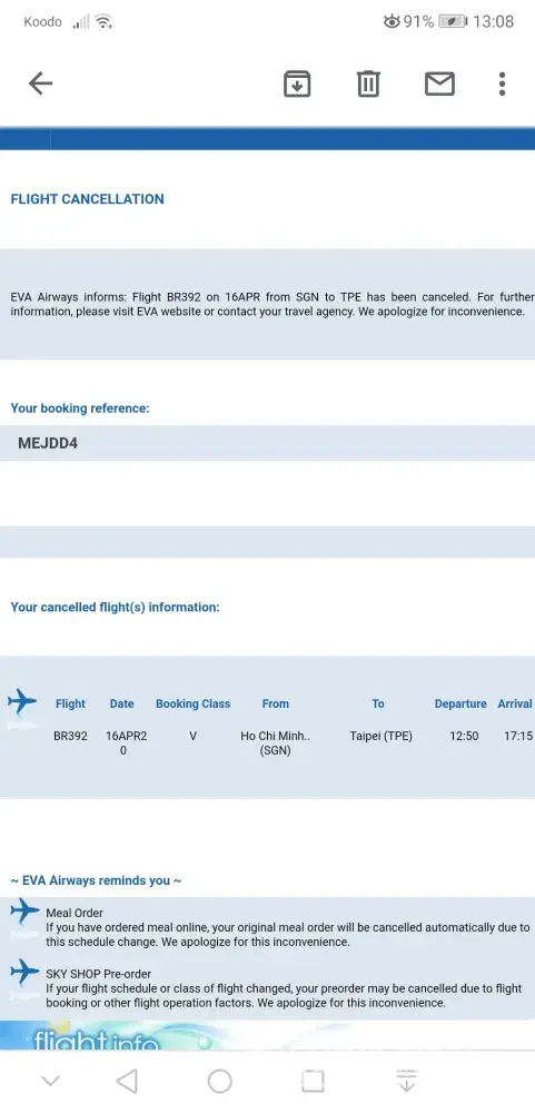 Hello, my name is Hien Do and I bought 2 tickets SGN-TPE, TPE-YYZ. However, I found the flight SGN-TPE will be operated by Eva Air had canceled due to COVID-19. Because of this circumstance, I would like you to full refund my ticket as soon as possible. My booking code are TG5EXN and MEJDD4 . please confirm my request and reply. Thank you.