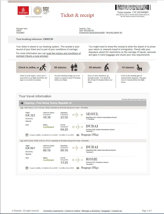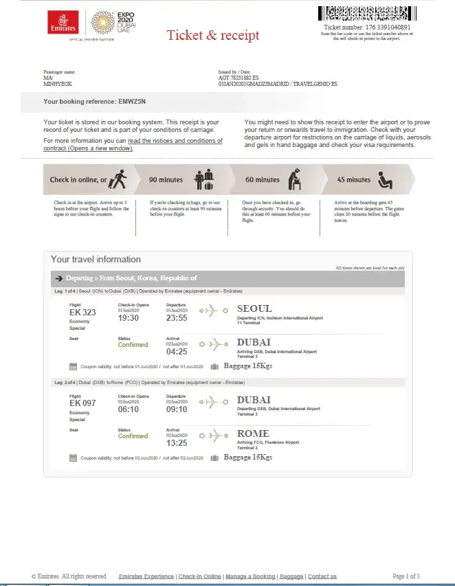 Hello? I am the person who reserved the plane ticket through Travelgenio. But the reason why I sent you this message is to cancel the plane tickets and get a refund because of bad situation by COVID-19. I reserved 2 tickets from Incheon to Rome via Dubai on June 1 and from Rome to Incheon via Dubai on June 18. The reservator's surname is MA and reservation code is JK4FXL. Originally, I booked a plane ticket for a trip to Italy, but I decided to cancel the trip after seeing very serious situation in Italy due to the COVID-19. Even if the corona virus situation end before June 1, I thought that there would be a very inappropriate atmosphere to travel due to the aftermath of the corona virus.