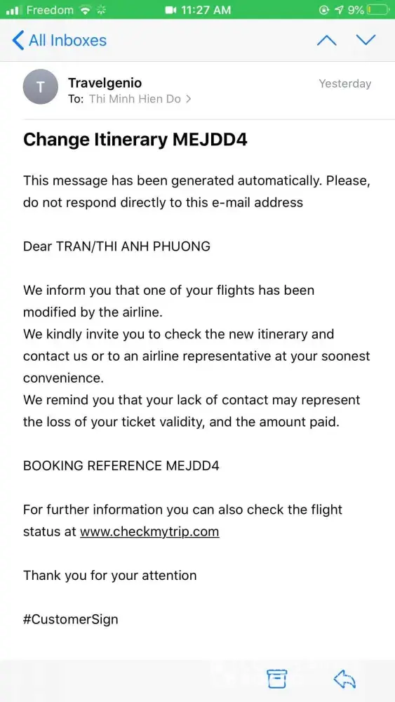 In February 2020 Japan time, although Travelgenio did not send me any reminder emails, I checked the online information myself and found that the flight on March 19 had been cancelled. By directly contacting China Eastern Airlines, I successfully changed to a flight on March 19.