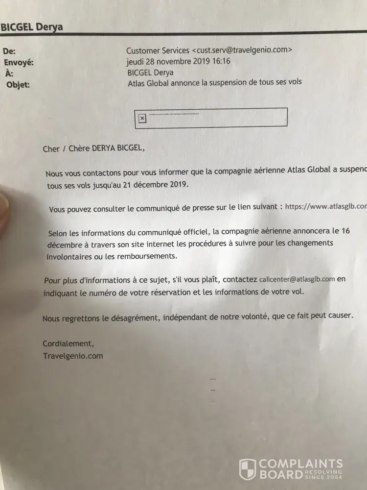 Nous vous contactons pour vous informer que la compagnie aérienne Atlas Global a suspendu tous ses vols jusqu'au 21 décembre 2019.