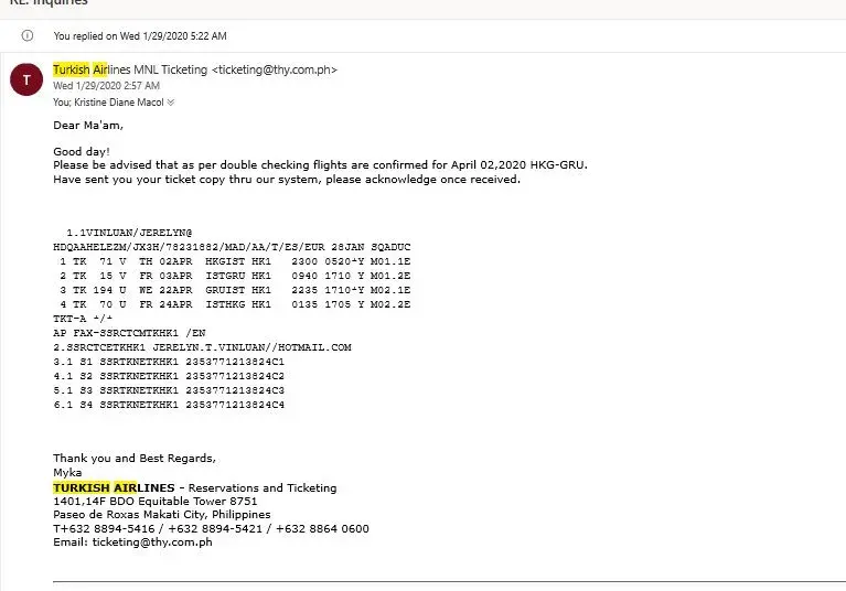 I purchased a RT Ticket Itinerary Apr 2-22 HKG-Gru.