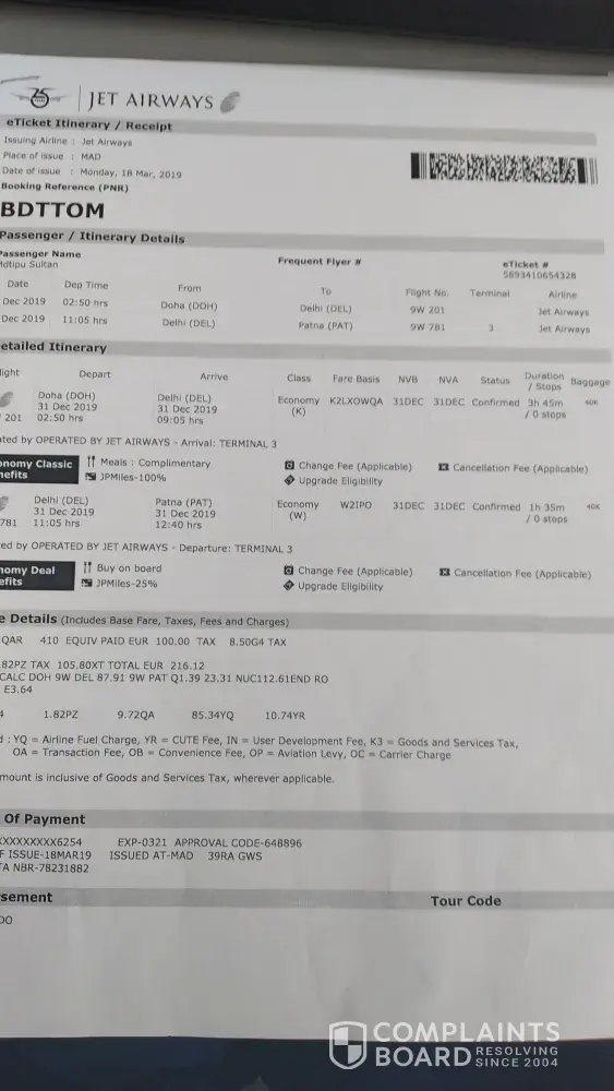 I had booked a jet airways flight from BOM-EWR-BOM uisng travelgenio on March 22, 2019.