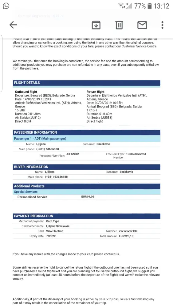 I have booked my ticket to Athens from Belgrade on the 13th of June and when I confirmed the booking I also included baggage and pay for it. The total amount for the round trip and baggage cost me 225 euros. When I came to the airport in Belgrade they claimed I did not pay for my baggage and they charged me 60 euro for one piece of baggage one way. Can you please check what happened and why I had to pay for.my baggage? I'm going back on June 30 from Athens to Belgrade so can you please confirm I have one piece of baggage included with my ticket. Also, I'm expecting refunds for baggage I had to pay